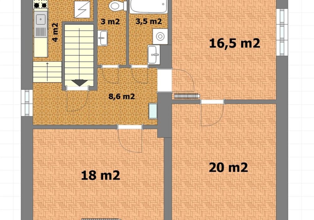 Za dveřmi bytu se nachází vstupní hala o velikosti 8,6 m2. Dále jsou k dispozici tři pokoje, 20,5 m2, 18 m2 a 16 m2, z haly je přístupná menší kuchyň s plynovým sporákem (4 m2). Příslušenství bytu doplňuje koupelna s vanou a umyvadlem o velikosti 3,5 m2 a samostatné WC s umyvadlem o velikosti 3 m2. Lepší představu o současné dispozici poskytne přiložený plánek bytu. Byt je vytápěn plynovým kotlem a radiátory. Okna jsou původní dřevěná špaletová a na podlahách jsou parkety a PVC. Byt se prodává ve stavu před komplexní rekonstrukcí a je tak možné si v rámci této rekonstrukce pohrát i se současnou dispozicí, změnit ji a upravit dle vašich potřeb a představ. V obrazové části inzerce je pro inspiraci vložen půdorys s návrhem možné přestavby na praktický byt 3+kk s neprůchozími pokoji, s kuchyňským koutem v obývacím pokoji a velkou koupelnou, která vznikne spojení současné koupelny s WC.