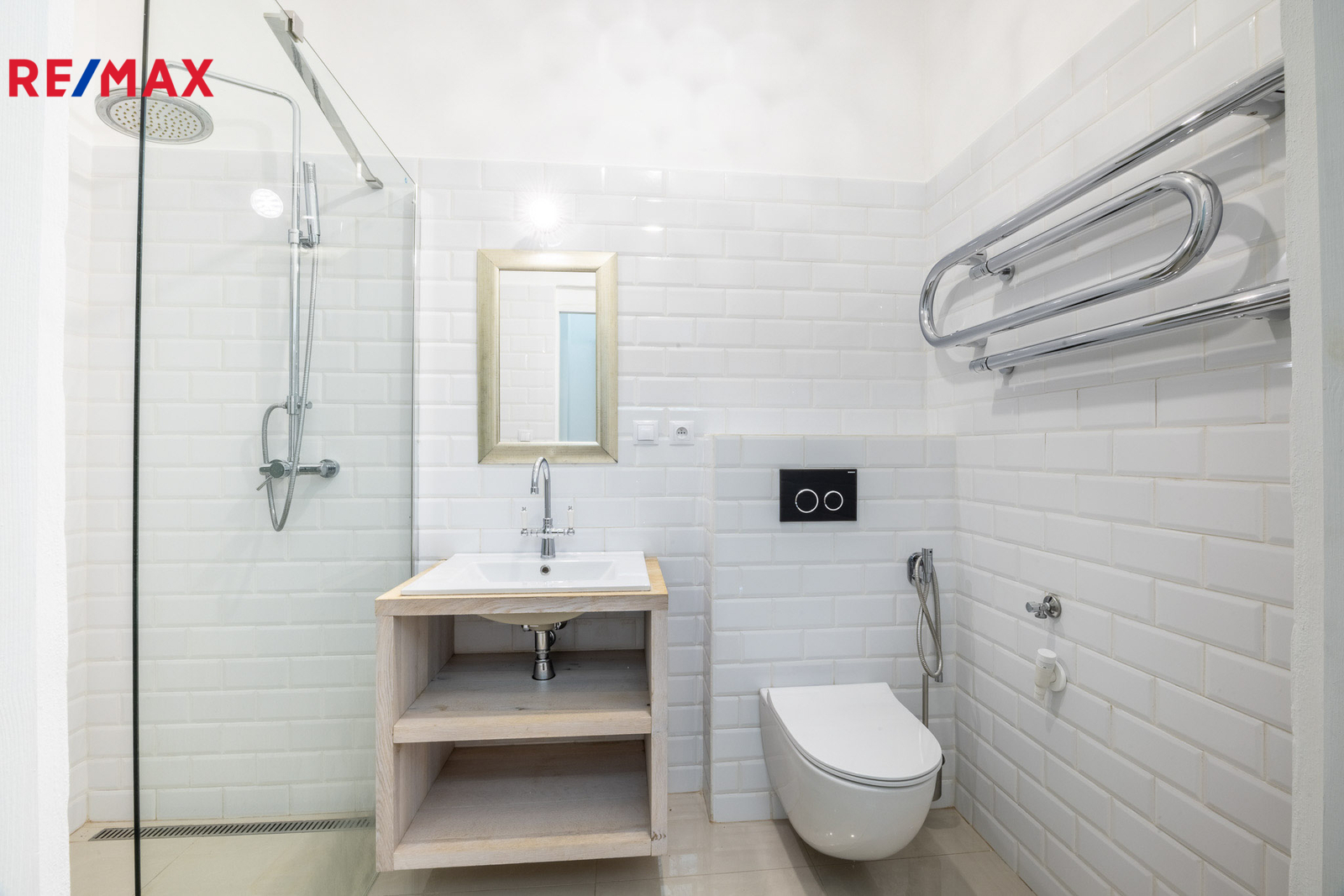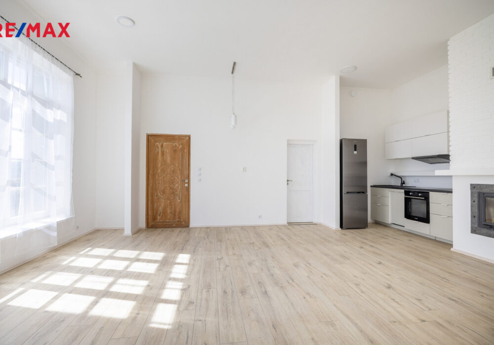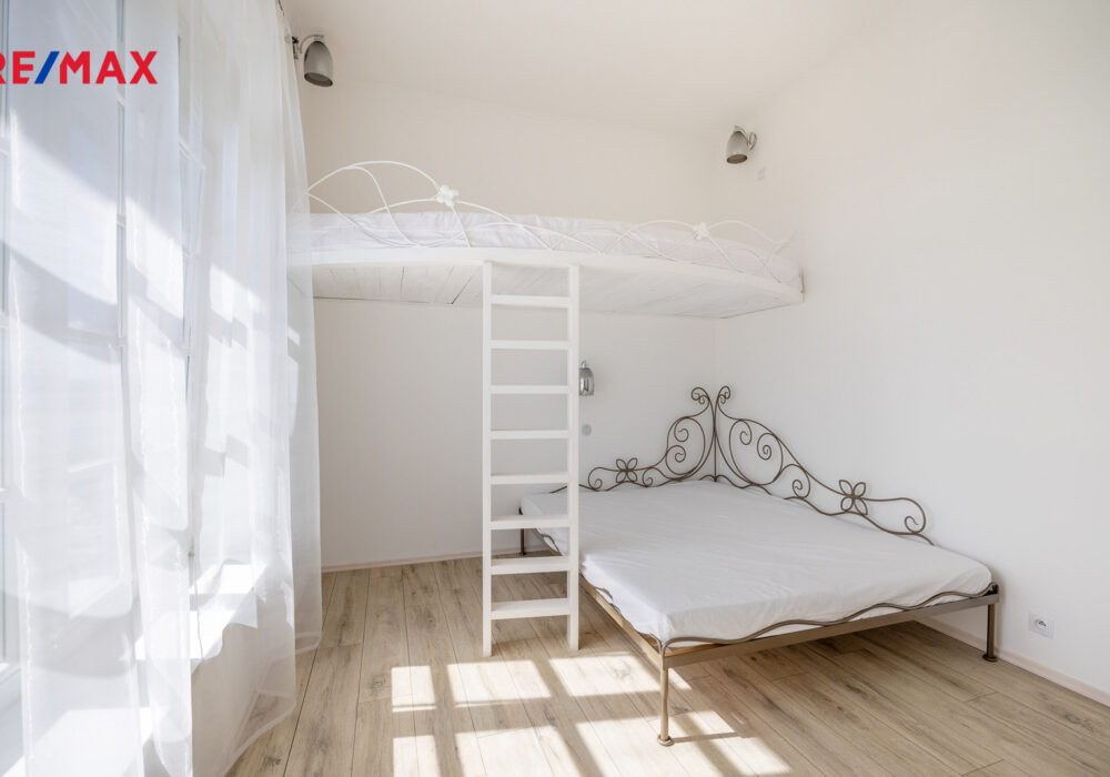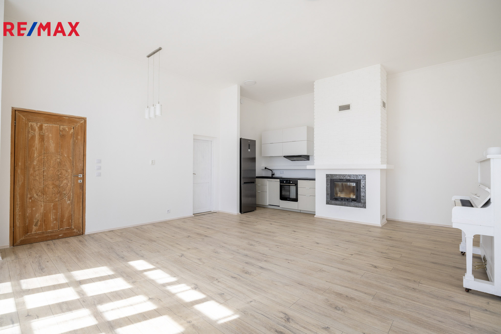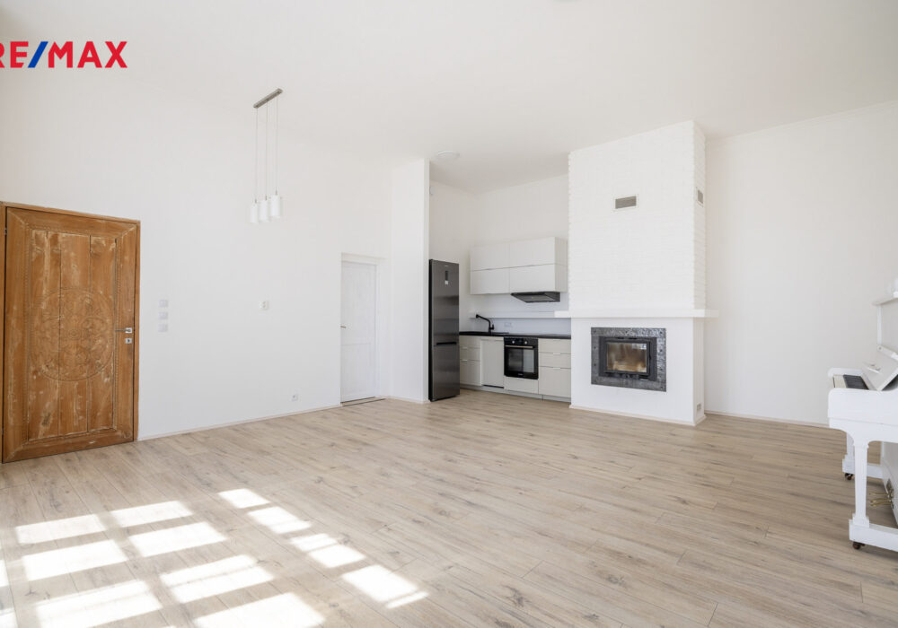 Přízemí: prostorný ateliér s kuchyňským koutem a koupelnou s WC, přímý vstup na velkou terasu o velikosti 33 m² a další bytová jednotka 1+kk s koupelnou a WC.