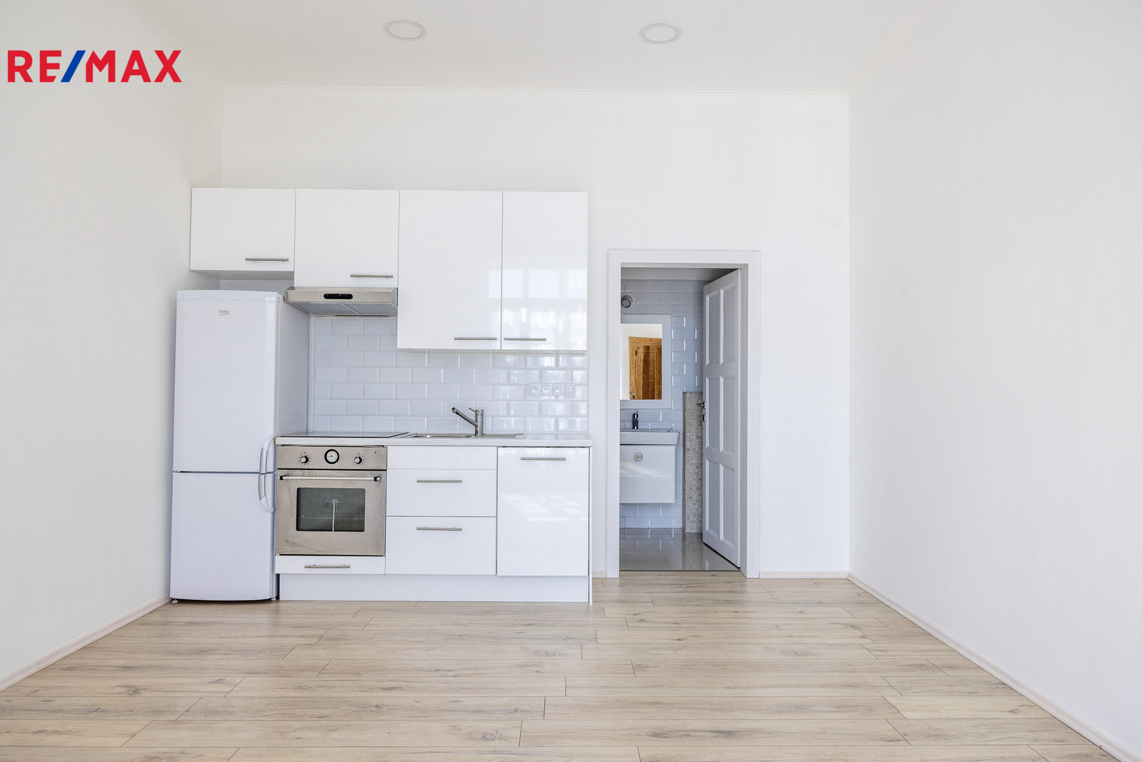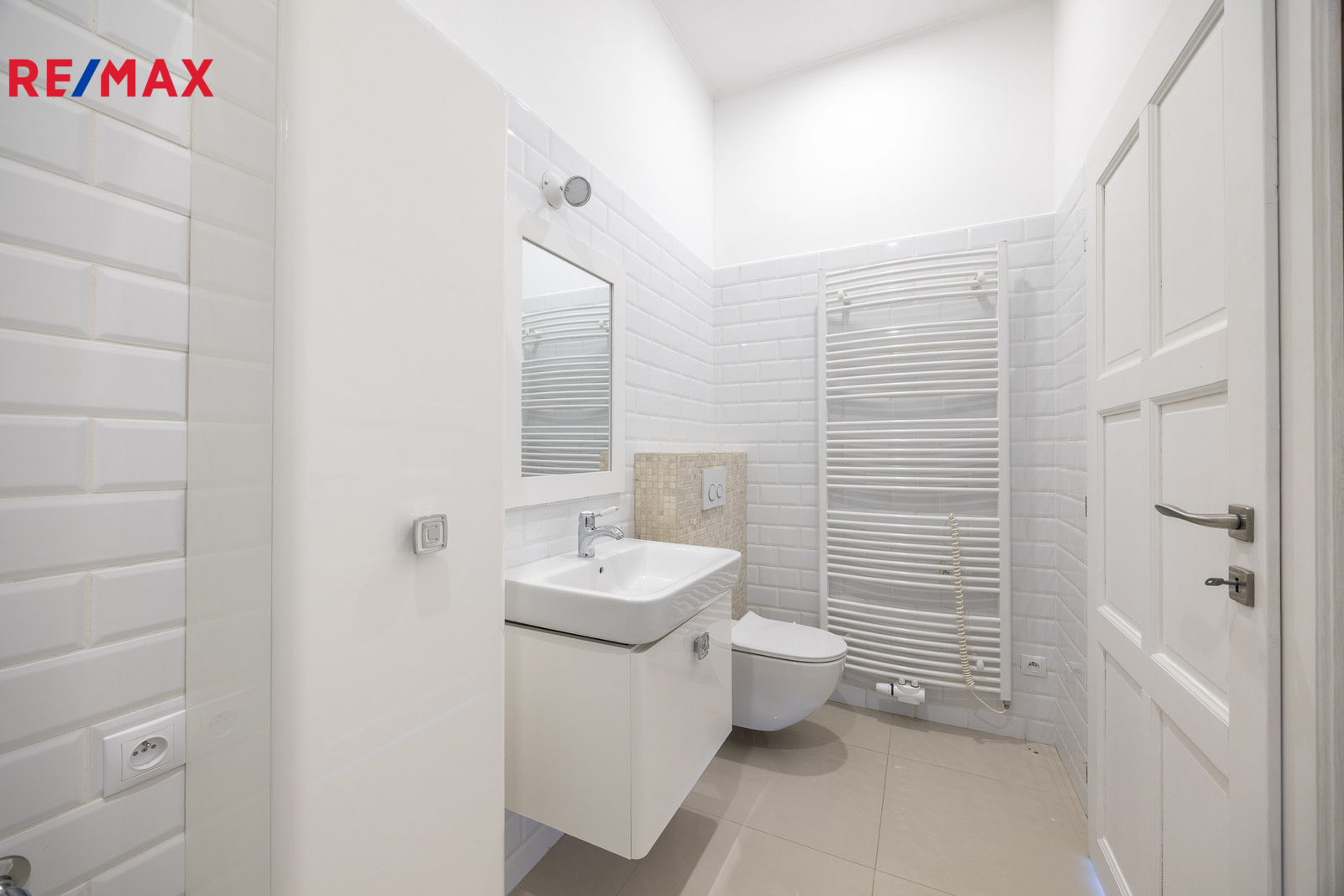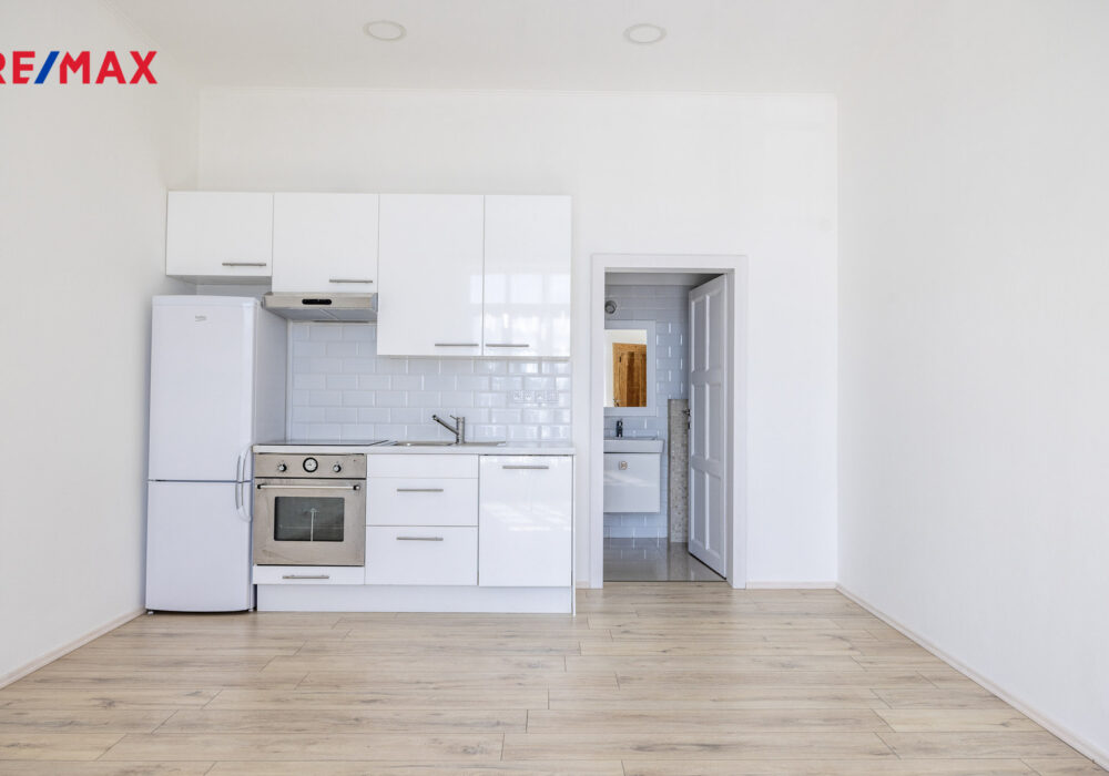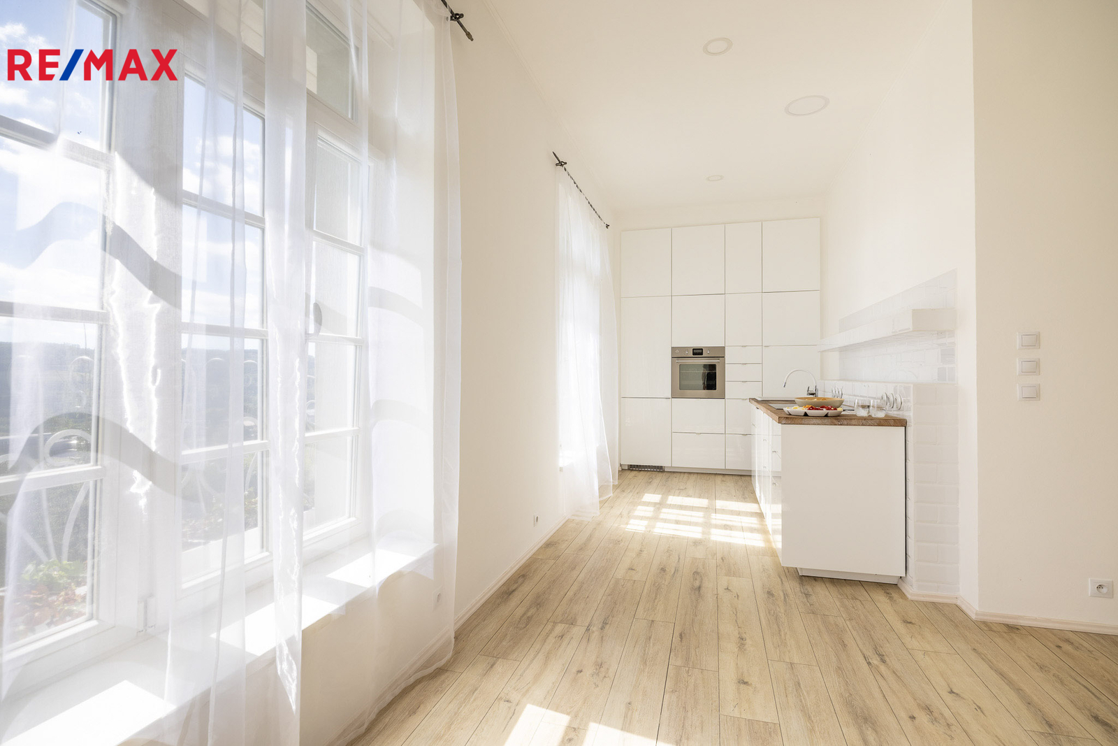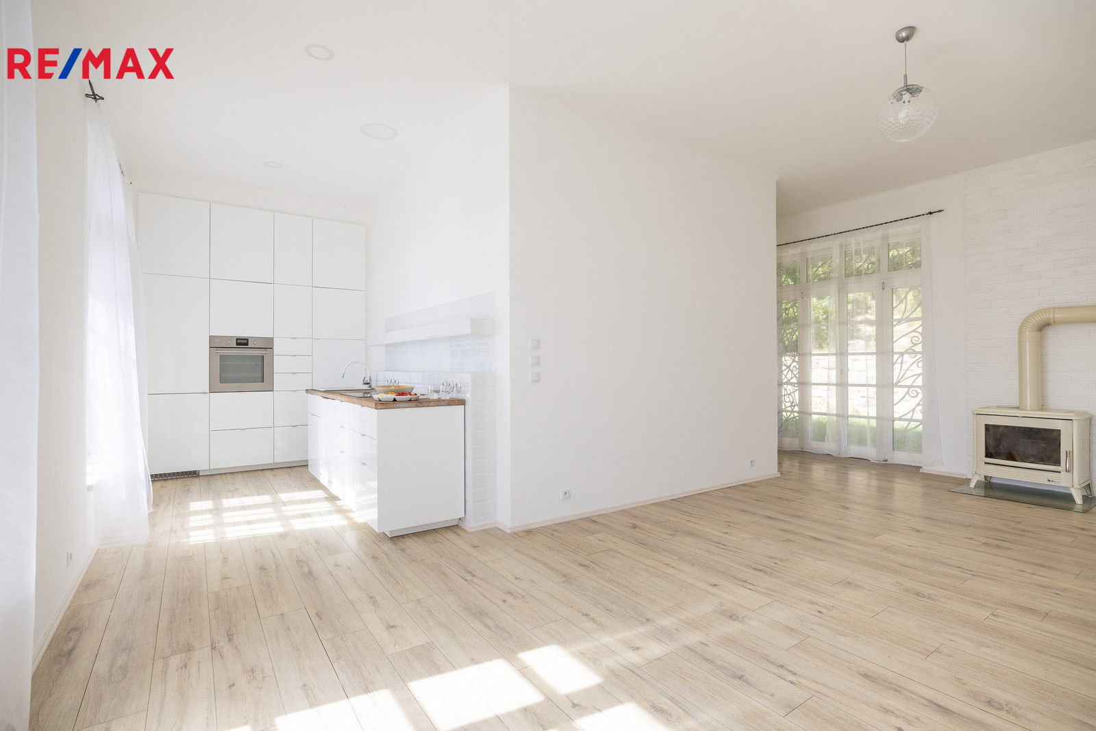 Přízemí: prostorný ateliér s kuchyňským koutem a koupelnou s WC, přímý vstup na velkou terasu o velikosti 33 m² a další bytová jednotka 1+kk s koupelnou a WC.