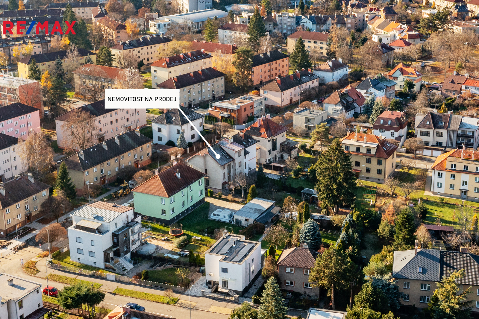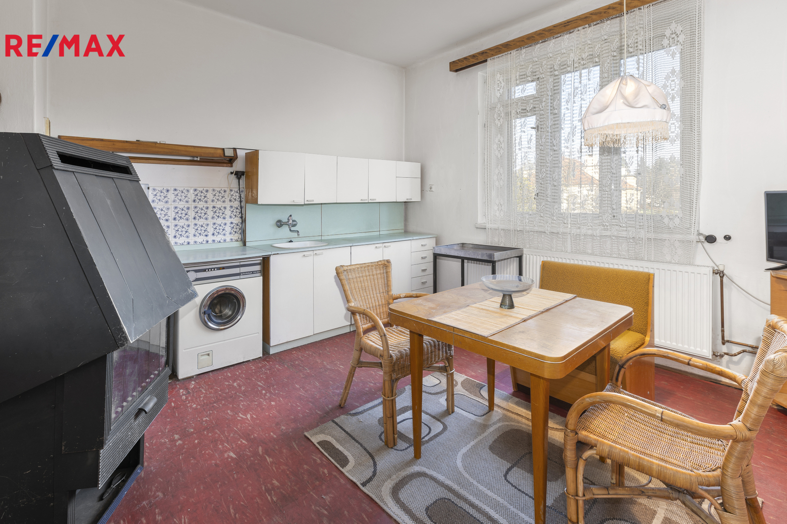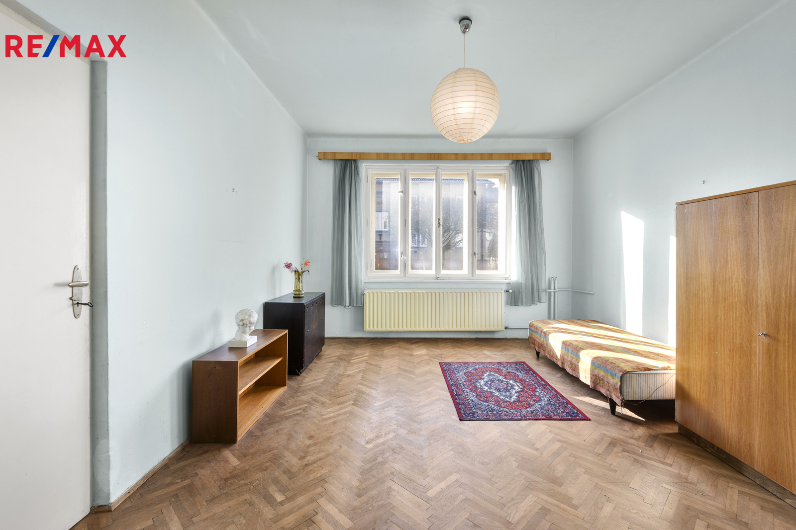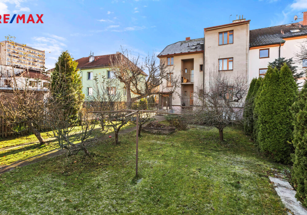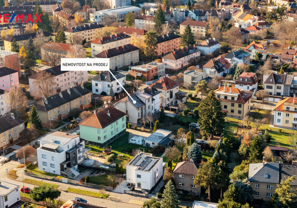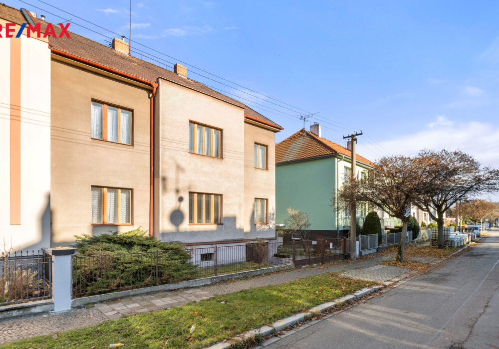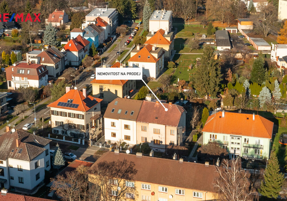 Nabízíme Vám výjimečnou investiční či rodinnou příležitost – řadovou vilu s celkovou podlahovou plochou cca 290 m² na pozemku o výměře 405 m². Dům má tři nadzemní podlaží se třemi byty se samostatnými vstupy. Suterén má výměru cca 85 m² – kde je garáž, technická místnost s kotlem na plyn, sklepy a prádelna. Dům je určen k rekonstrukci a je napojen na všechny inženýrské sítě a stojí na rovinatém pozemku; v zadní části zahrady se nachází zahradní domek s elektrickým připojením. Dům byl postaven v roce 1940, je v původním stavu – původní dřevěná okna, střecha z eternitu a původní parketové podlahy.
