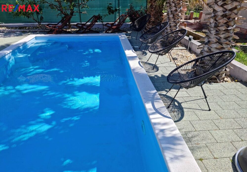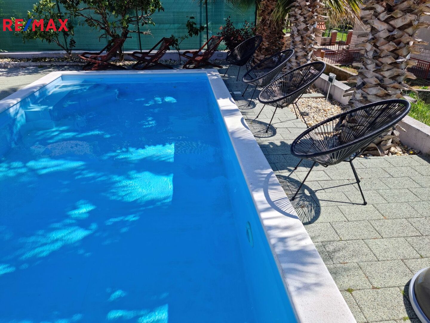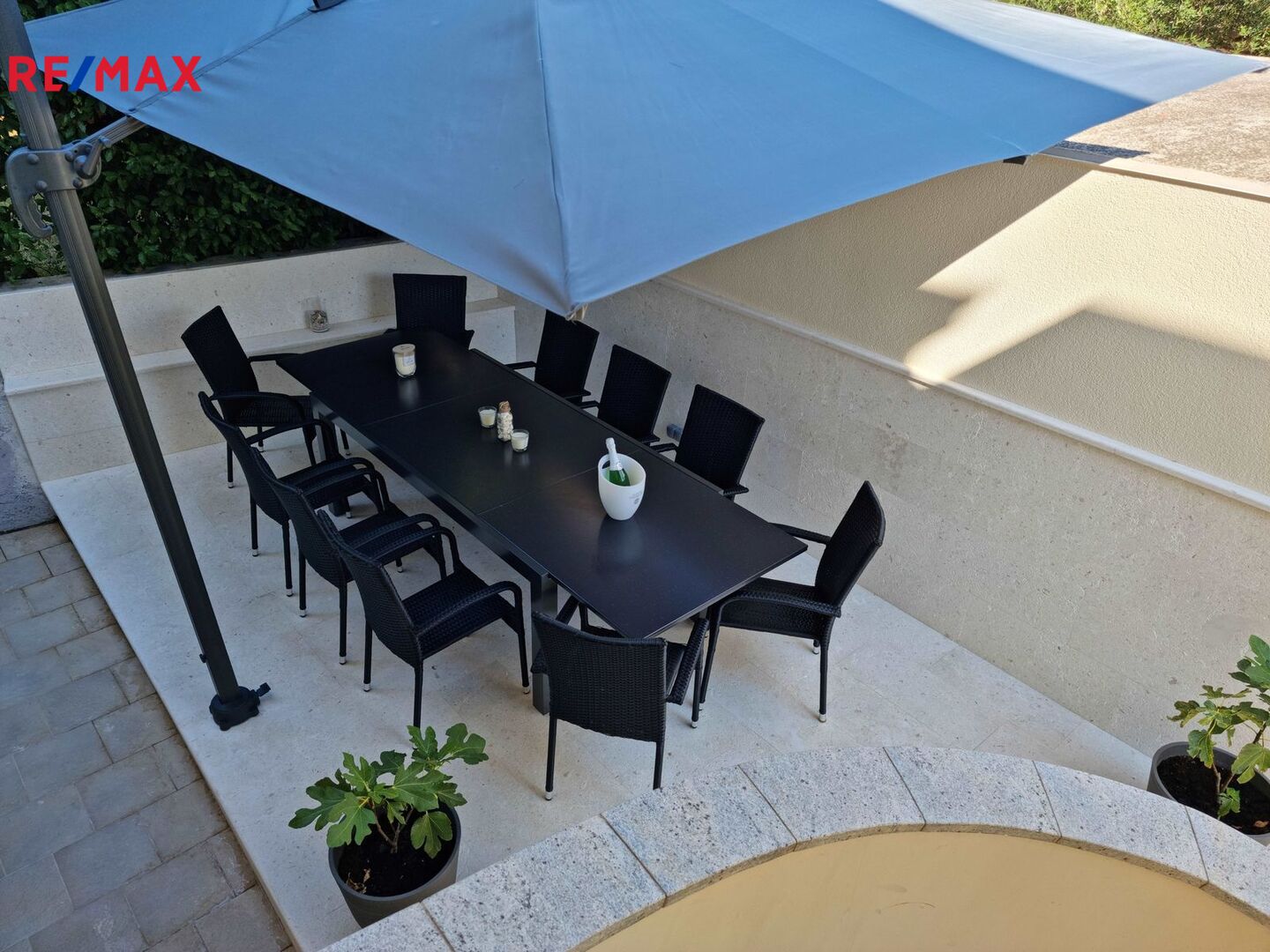 Parkoviště pro 4 vozidla, vyhřívaný bazén 8x4m, gril + zastřešená terasa s posezením pro 12 osob, venkovní sprcha u bazénu
