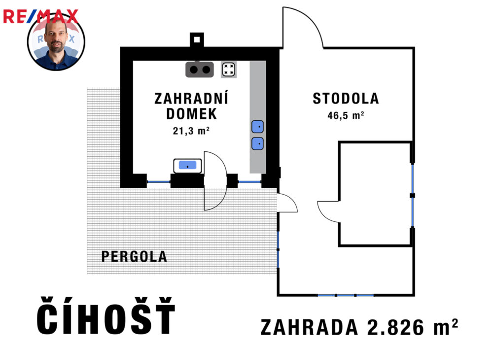 Pozemková parcela č. 100/9 o výměře 2.719 m² v obci Číhošť byla dosud využívána jako zahrada. Na stavební parcele St. 145 o výměře 107 m² stojí zděný zahradní domek (evidenční číslo 39) s užitnou plochou 21,4 m² a dřevěnou pergolou (cca 21,5 m²). Na domek navazuje dřevěná stodola (cca 46,5 m²) a za ní se nachází suché WC. Obytná část je napojena na elektřinu (230/400 V), obecní vodovod a vlastní kanalizační jímku. Stodola slouží jako sklad nářadí a materiálu.
