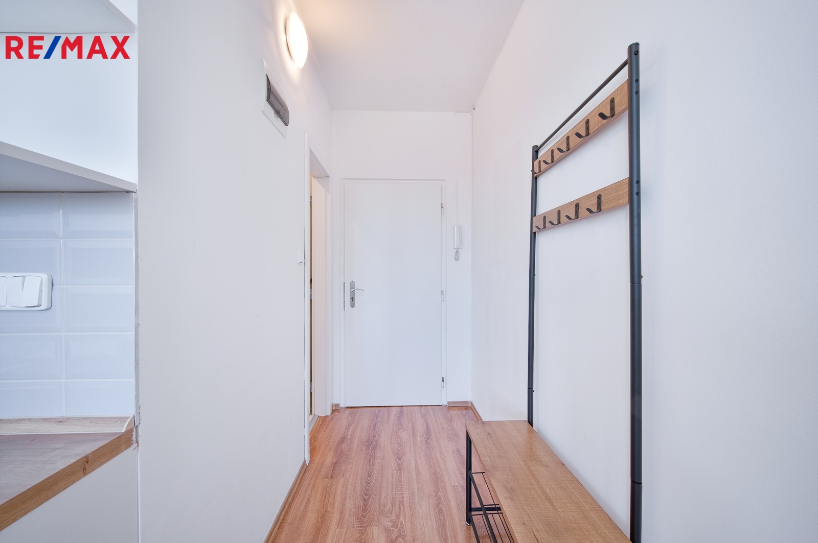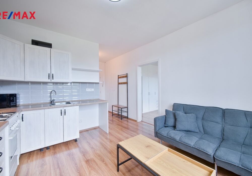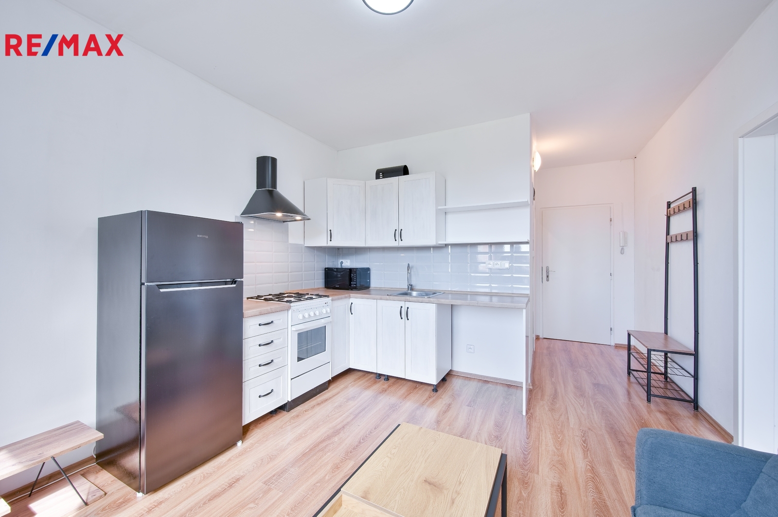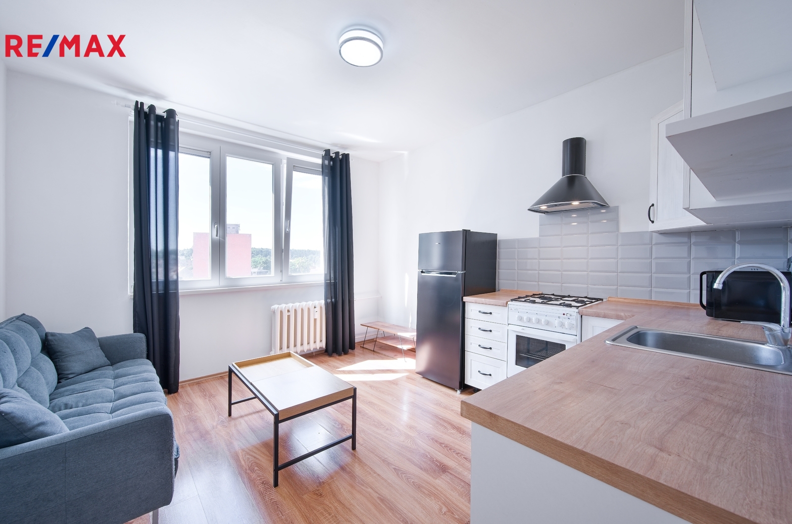Ve výhradním zastoupení nabízíme k pronájmu byt o dispozici 1+1 a celkové výměře 35,75m2. Bytová jednotka v osobním vlastnictví, se nachází ve 5.NP panelového domu o celkem 8. podlažích s výtahem. Bytová jednotka prošla vkusnou kompletní rekonstrukcí pár let zpět. Ze vstupní chodby se dostaneme do moderně zařízené koupelny a také do hlavního pokoje, kde je kuchyň propojena s obývákem. Dále zde pak nalezneme poměrně prostornou ložnici. K bytu náleží sklepní kóje.