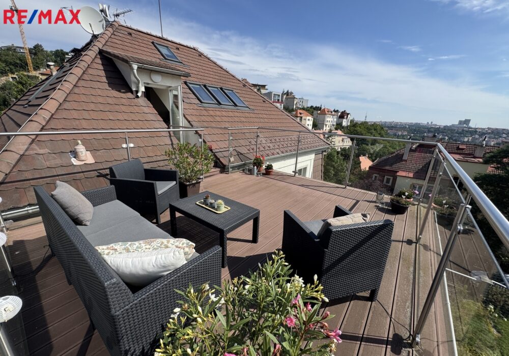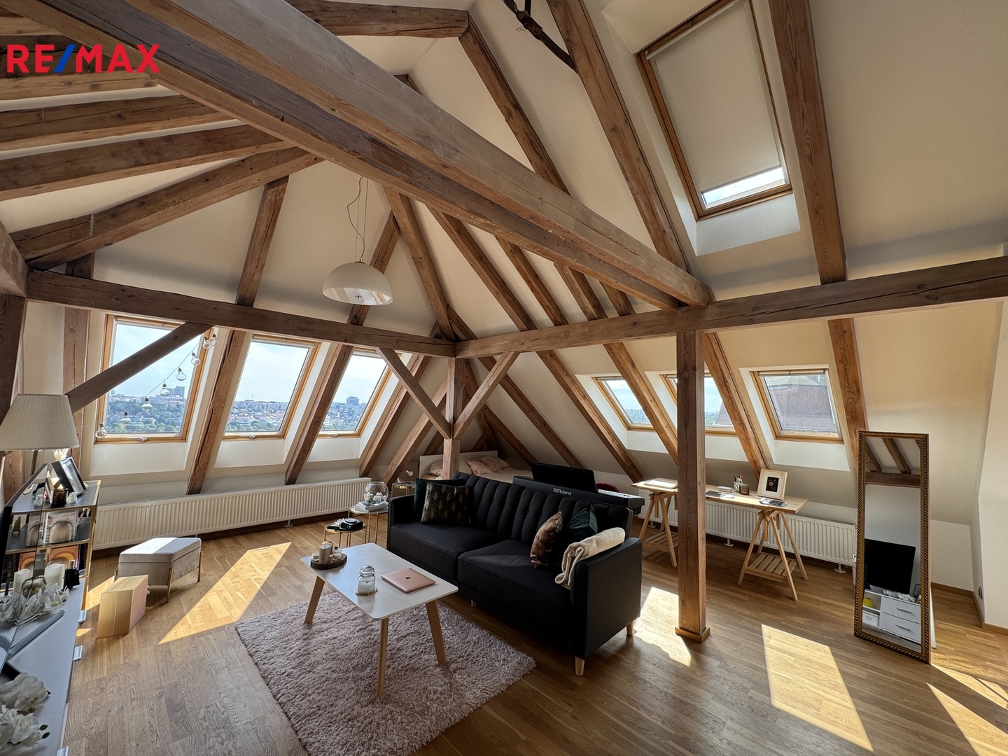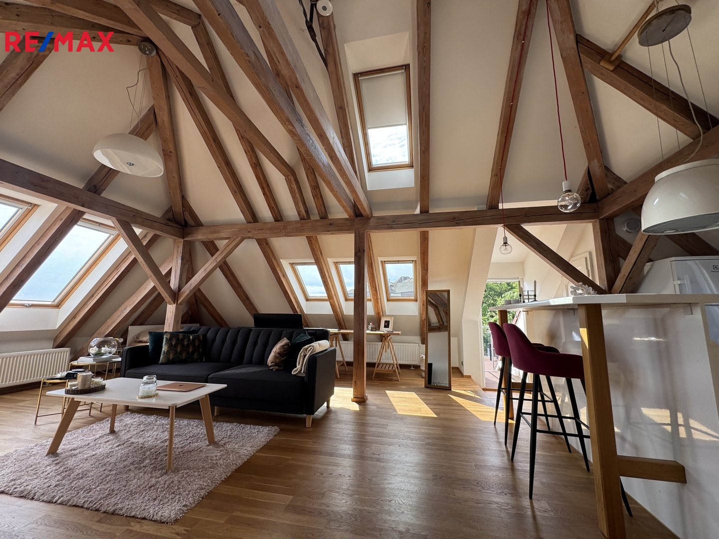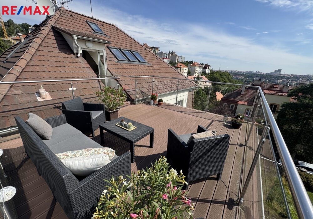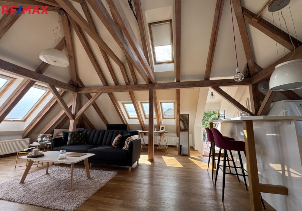 Byt o celkové výměře (104 m2) disponuje terasou (20 m2) s dechberoucím výhledem na Prahu a naprostým soukromím. Dispozičně je byt koncipován jako jeden velký otevřený prostor s přiznanými trámy, je zde samostatná praktická šatna, koupelna se sprchovým koutem, kompletně vybavená kuchyňská linka.