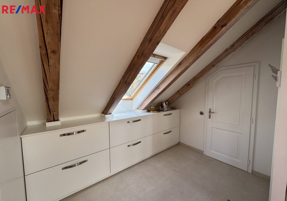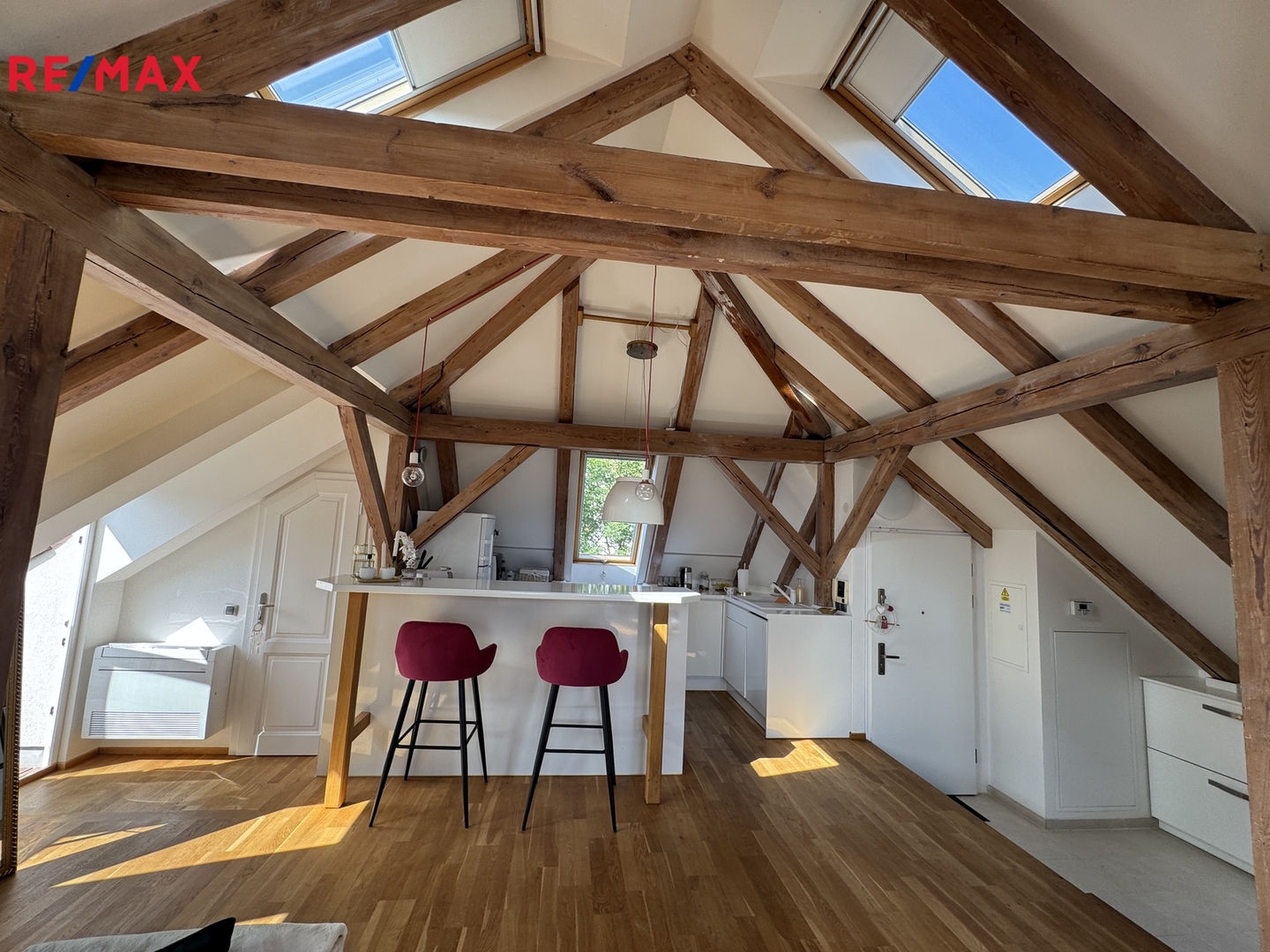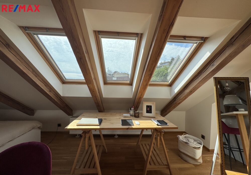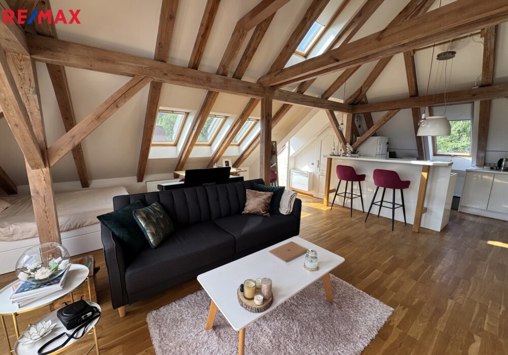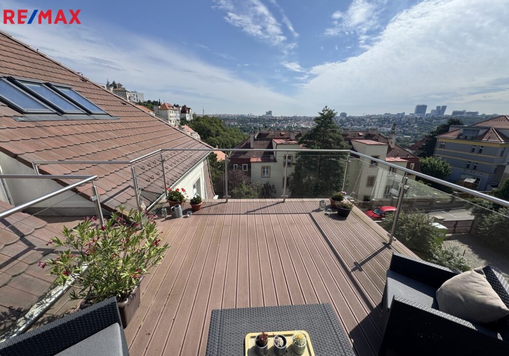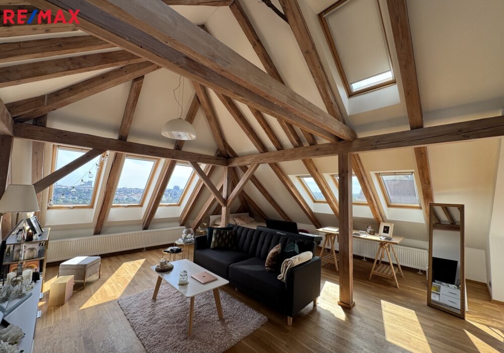 Byt o celkové výměře (104 m2) disponuje terasou (20 m2) s dechberoucím výhledem na Prahu a naprostým soukromím. Dispozičně je byt koncipován jako jeden velký otevřený prostor s přiznanými trámy, je zde samostatná praktická šatna, koupelna se sprchovým koutem, kompletně vybavená kuchyňská linka.