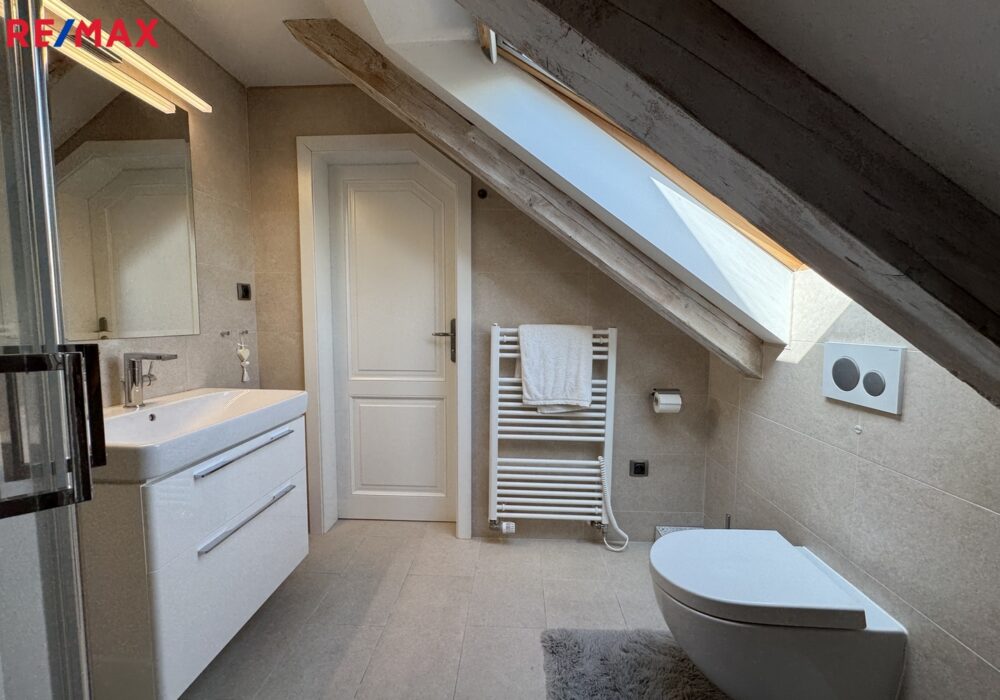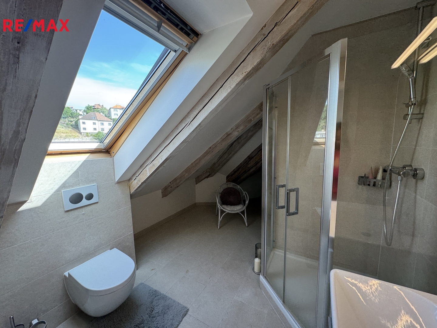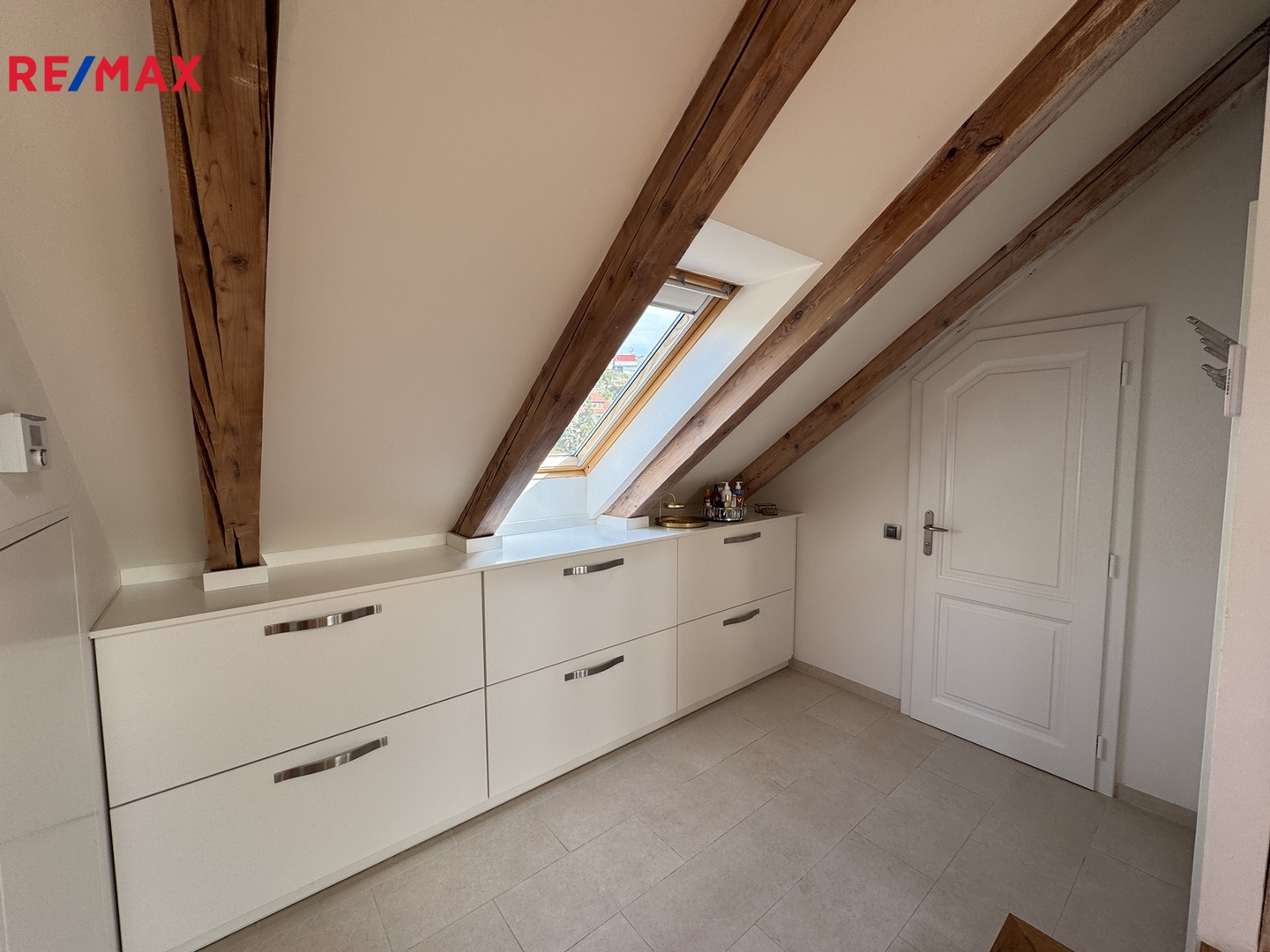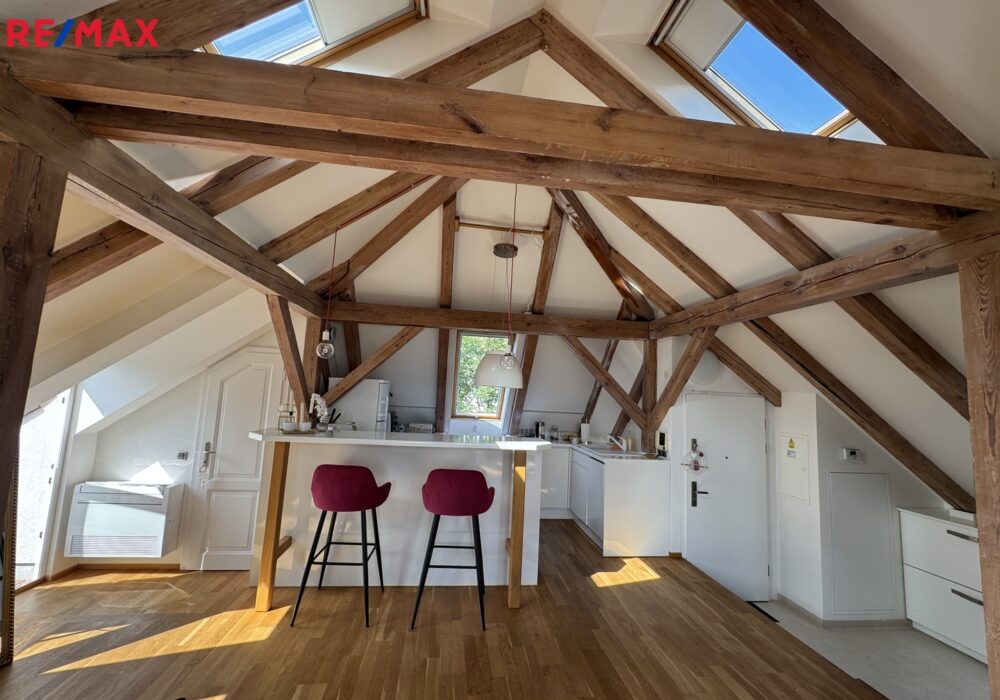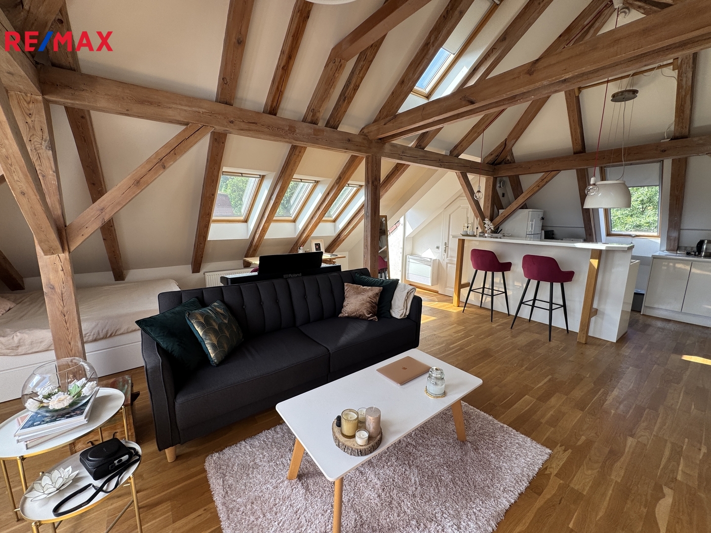 Byt o celkové výměře (104 m2) disponuje terasou (20 m2) s dechberoucím výhledem na Prahu a naprostým soukromím. Dispozičně je byt koncipován jako jeden velký otevřený prostor s přiznanými trámy, je zde samostatná praktická šatna, koupelna se sprchovým koutem, kompletně vybavená kuchyňská linka.