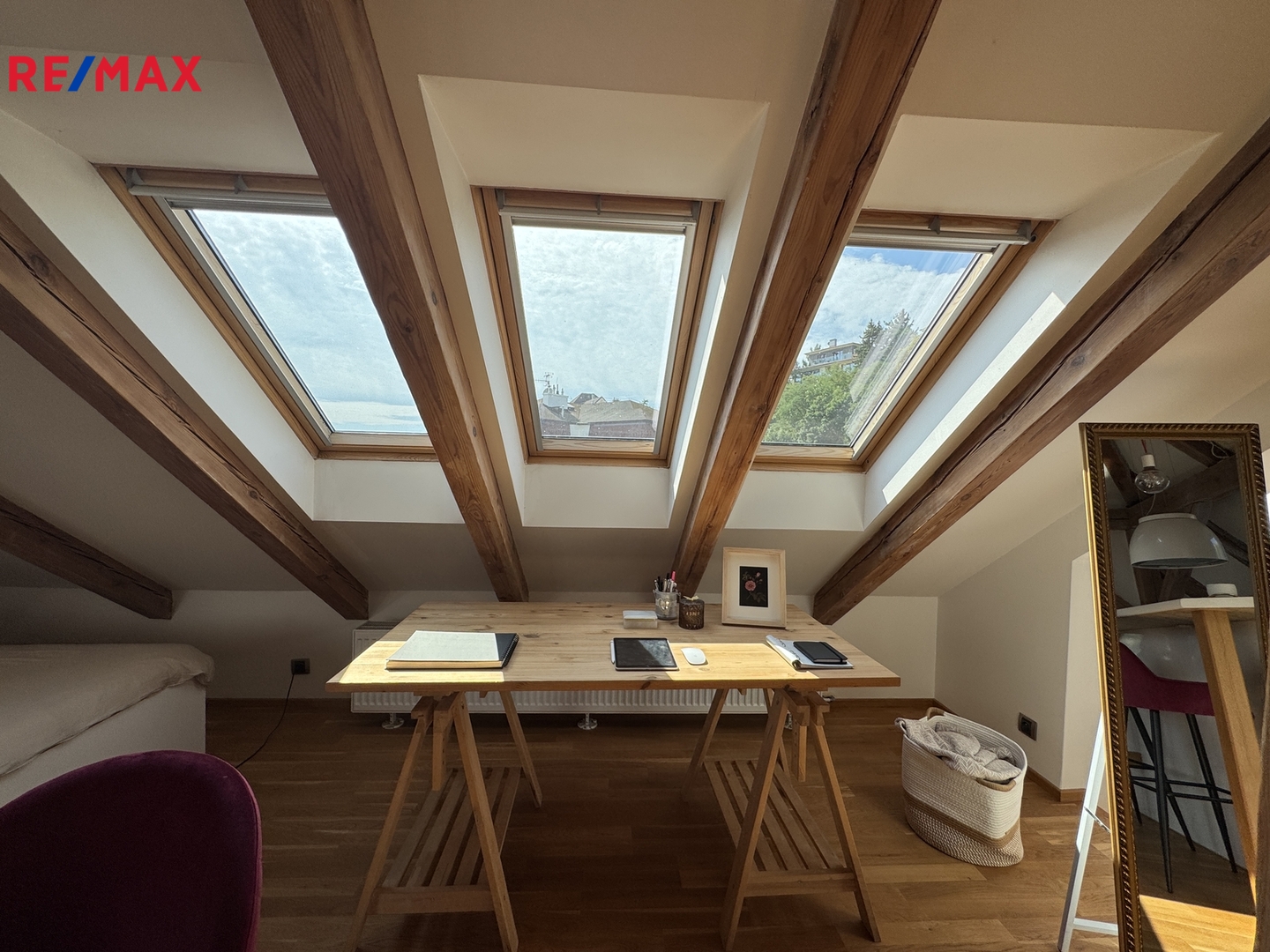 Podnájem výjimečného atypického bytu v podkroví zrekonstruované vily v jedné z nejoblíbenějších rezidenčních čtvrtí Prahy- na  Dívčích hradech. Prvorepubliková vila prošla celkovou citlivou rekonstrukcí, nabízí vysoký standard bydlení  s překrásným výhledem na Prahu.