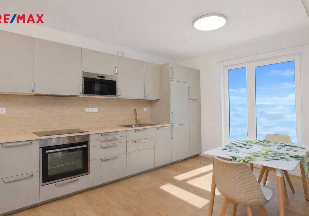 Dominantou tohoto bytu je prostorný obývací pokoj s kuchyňským koutem vybaveným moderní kuchyňskou linkou s veškerými vestavěnými spotřebiči.