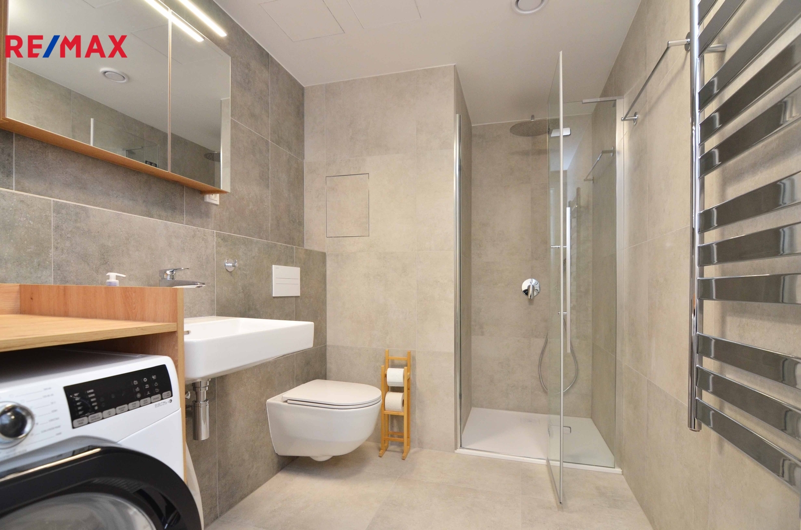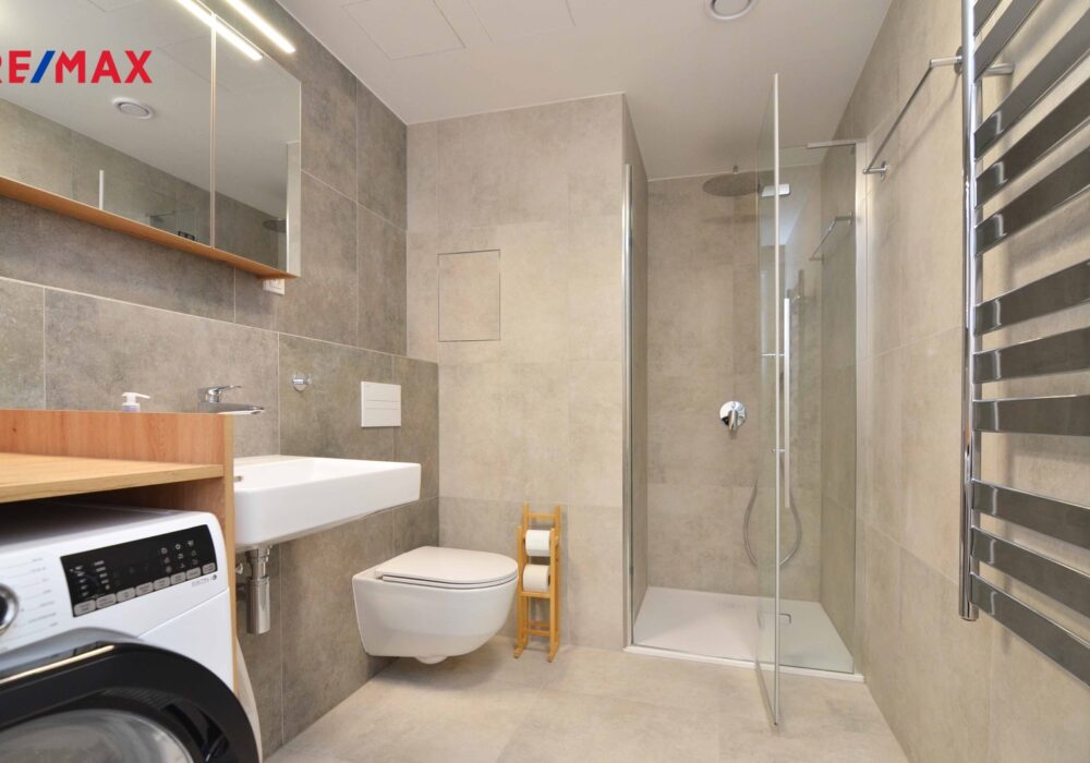 Velká koupelna se sprchovým koutem, umyvadlem, WC a pračkou se sušičkou.