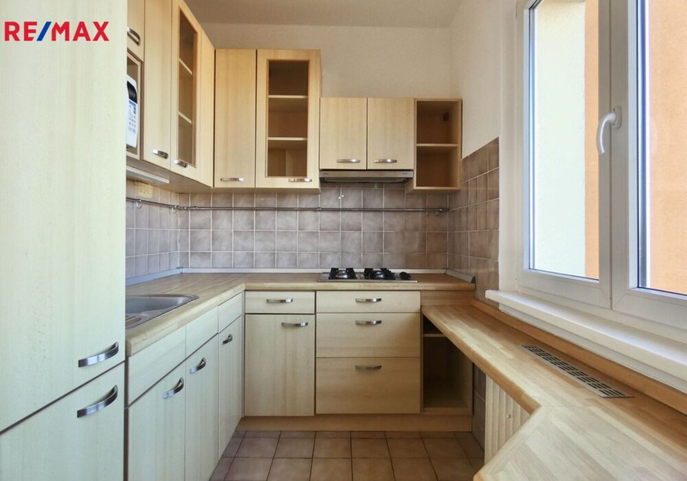 Prostorný obývací pokoj se vstupem na balkón a ložnice mají na podlahách krásné dřevěné parkety, samostatná zařízená kuchyň má stejně jako koupelna a toaleta na podlaze dlažbu. V předsíni, kde je umístěna prostorná vestavěná skříň, najdeme laminátovou plovoucí podlahu. Kuchyň je vybavena plynovou varnou deskou, digestoří, lednicí s mrazákem, mikrovlnnou troubou a dostatkem pracovního i úložného prostoru. Koupelna s vanou je vybavena pračkou, toaleta je samostatná.