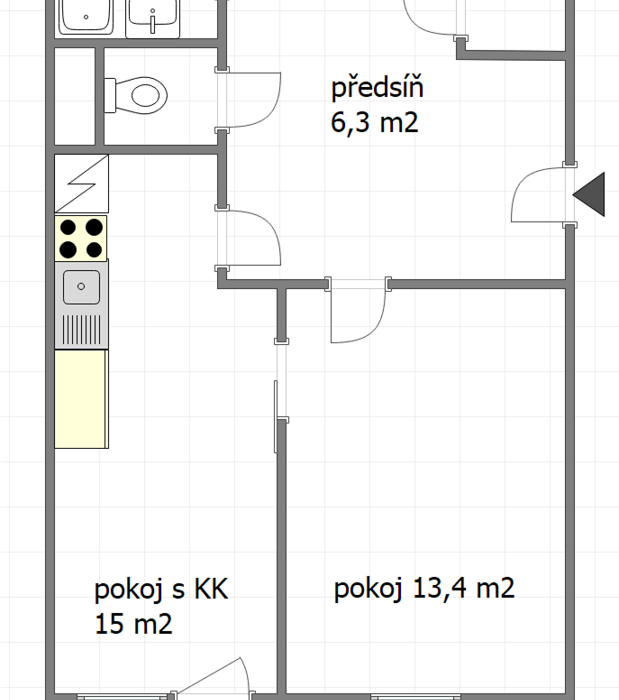 Pokoj s kuchyňským koutem a vstupem na lodžii má velikost 15 m2. Disponuje plně vybavenou kuchyňskou linkou vč. nádobí, sporákem s digestoří, velkou lednicí, stolem s židlemi.