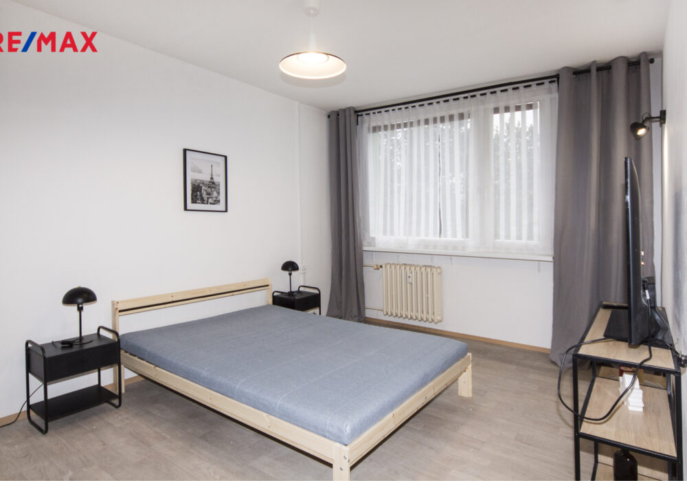 Ložnice o velikosti 13,4 m2 je vybavena novým nábytkem (postel, noční stolky, Smart TV, komoda, závěsy – vše jak vidíte na fotografiích).