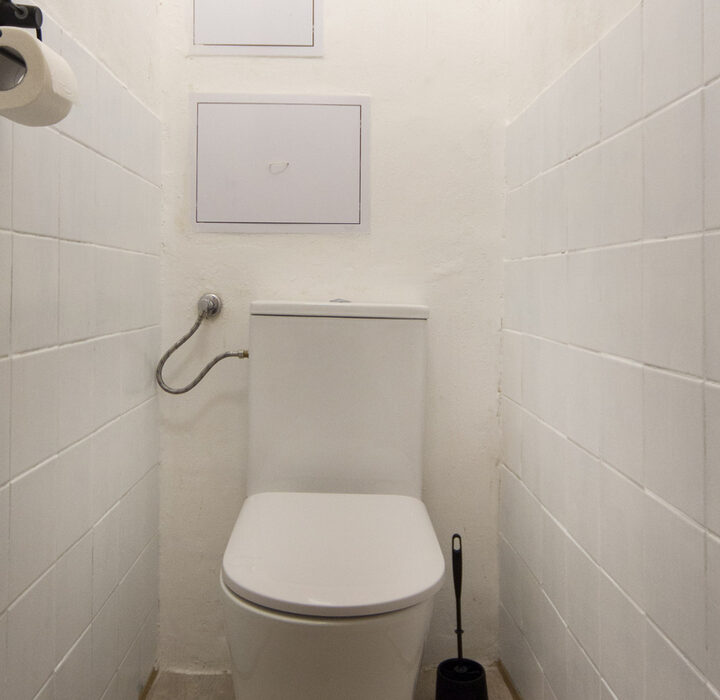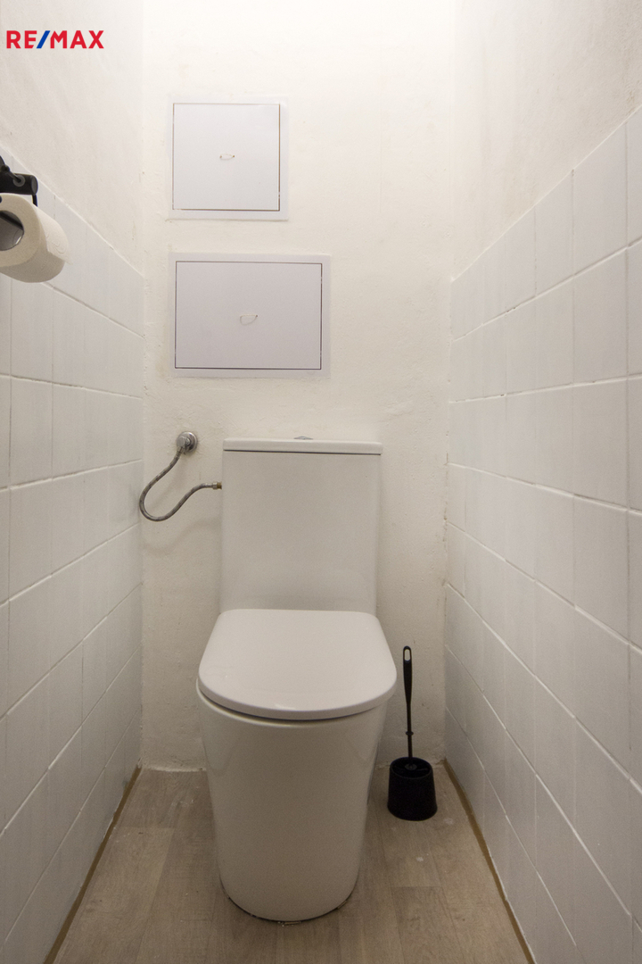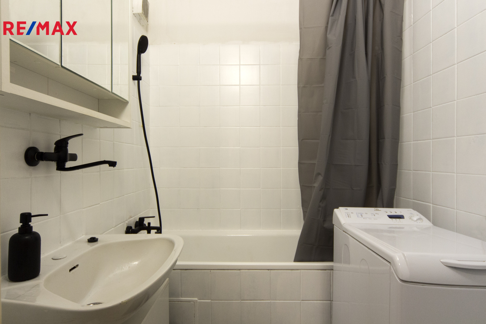 Koupelna je zařízena vanou a pračkou, WC zvlášť.