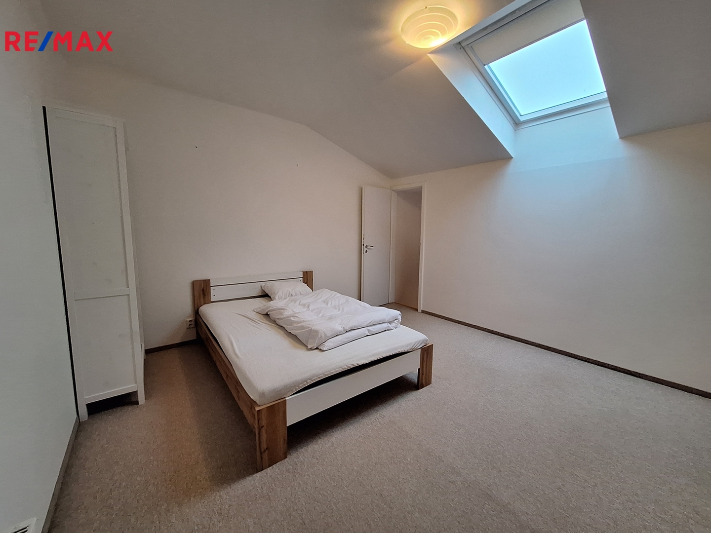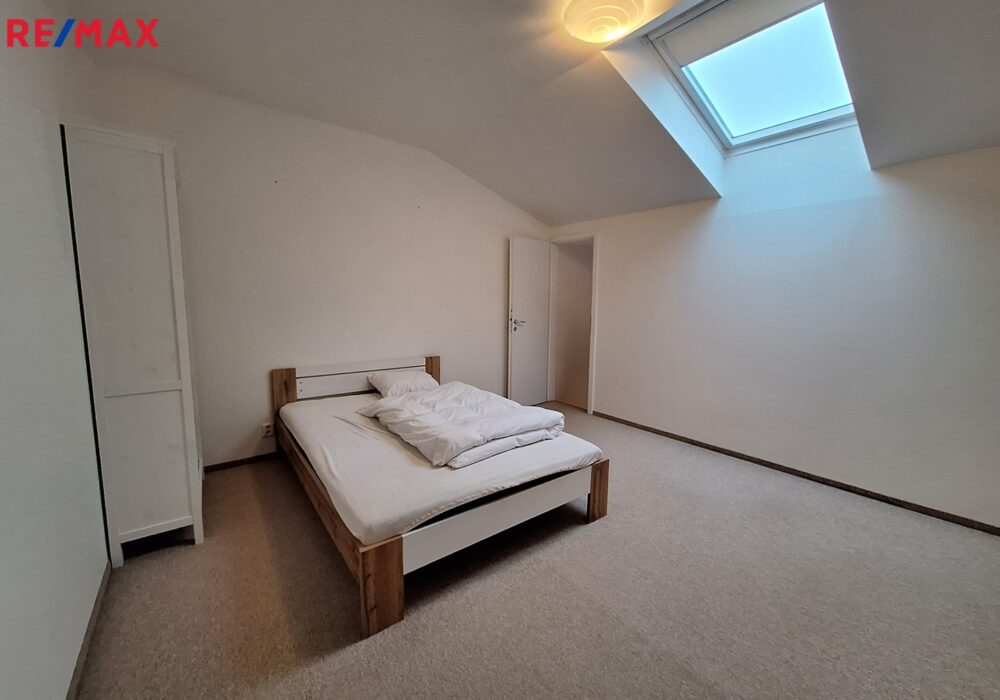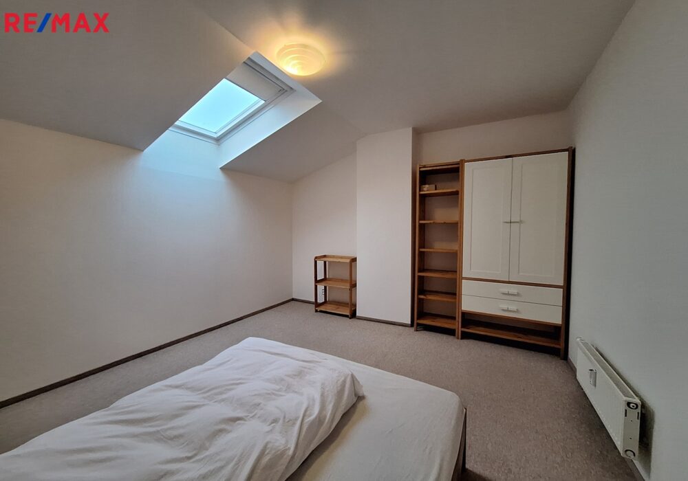 Ložnice se nachází v patře a je přístupná schodištěm přímo z obývacího pokoje.