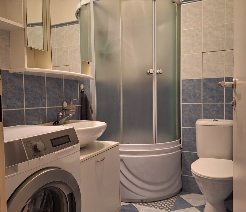 Koupelna má sprchový kout, umyvadlo, WC a je vybavena pračkou AEG.