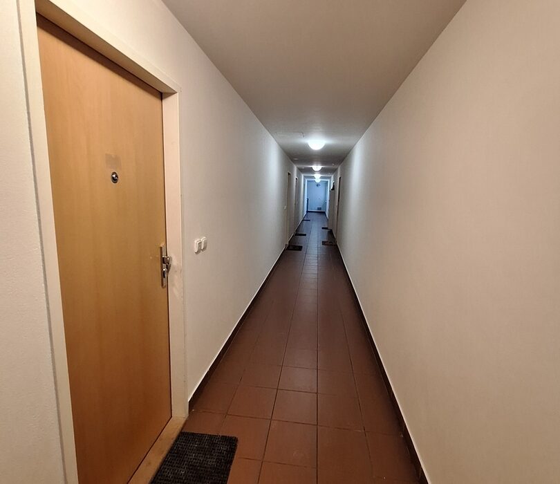 Byt se nachází ve třetím nadzemním podlaží, má prostornou vstupní chodbu s praktickou vestavěnou skříní. Dále vzdušný a světlý obývací pokoj s kuchyňským koutem vybaveným vestavěnými spotřebiči.