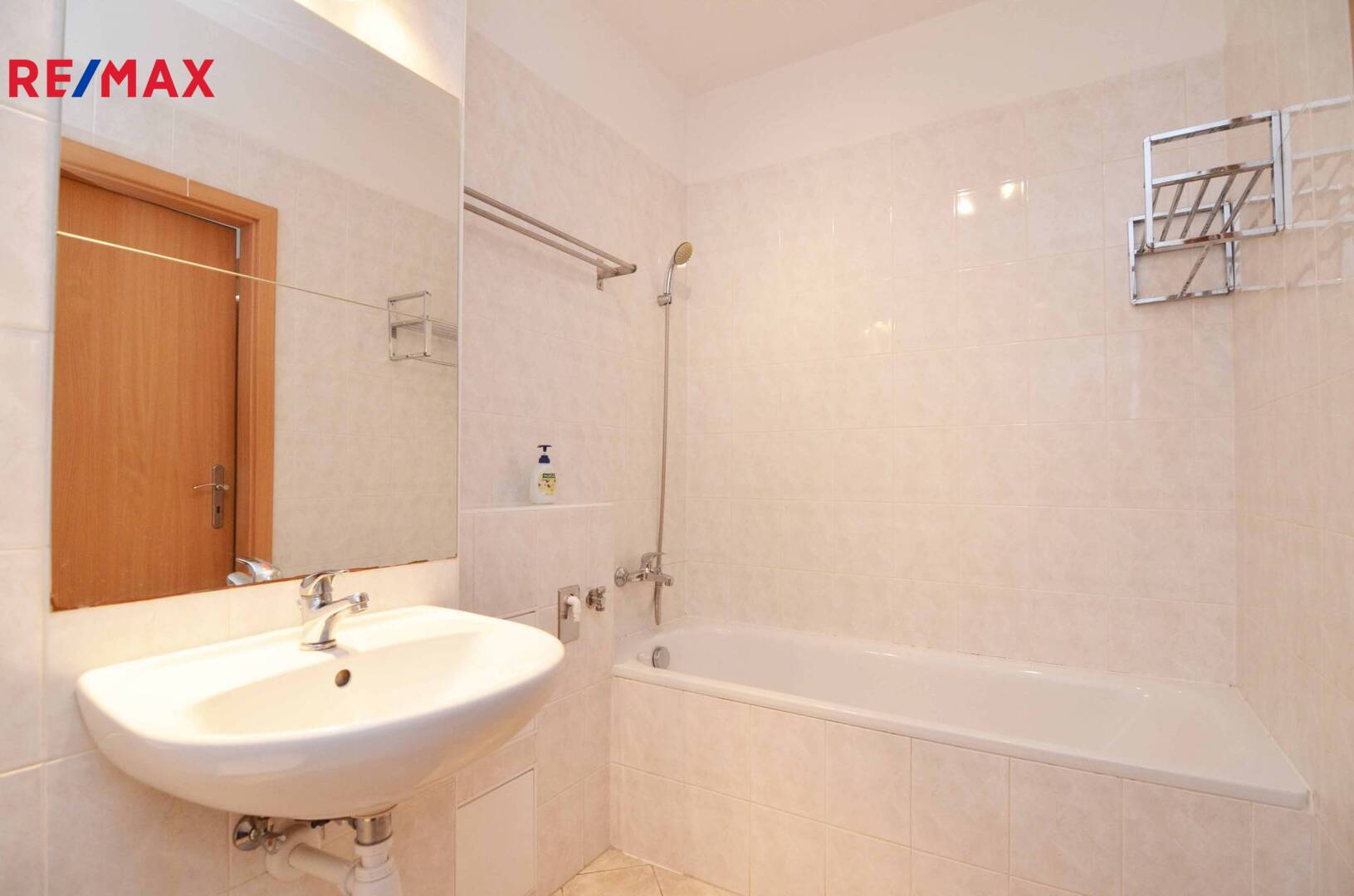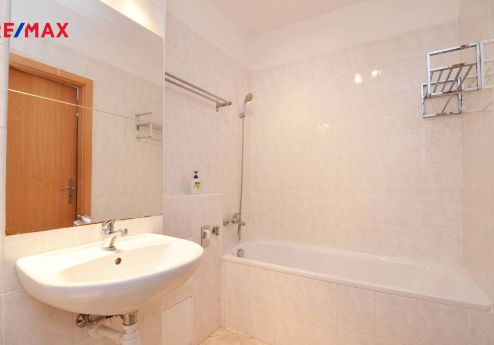 Prostorná koupelna s vanou, umyvadlem a WC. Samozřejmostí je též komora v bytě.