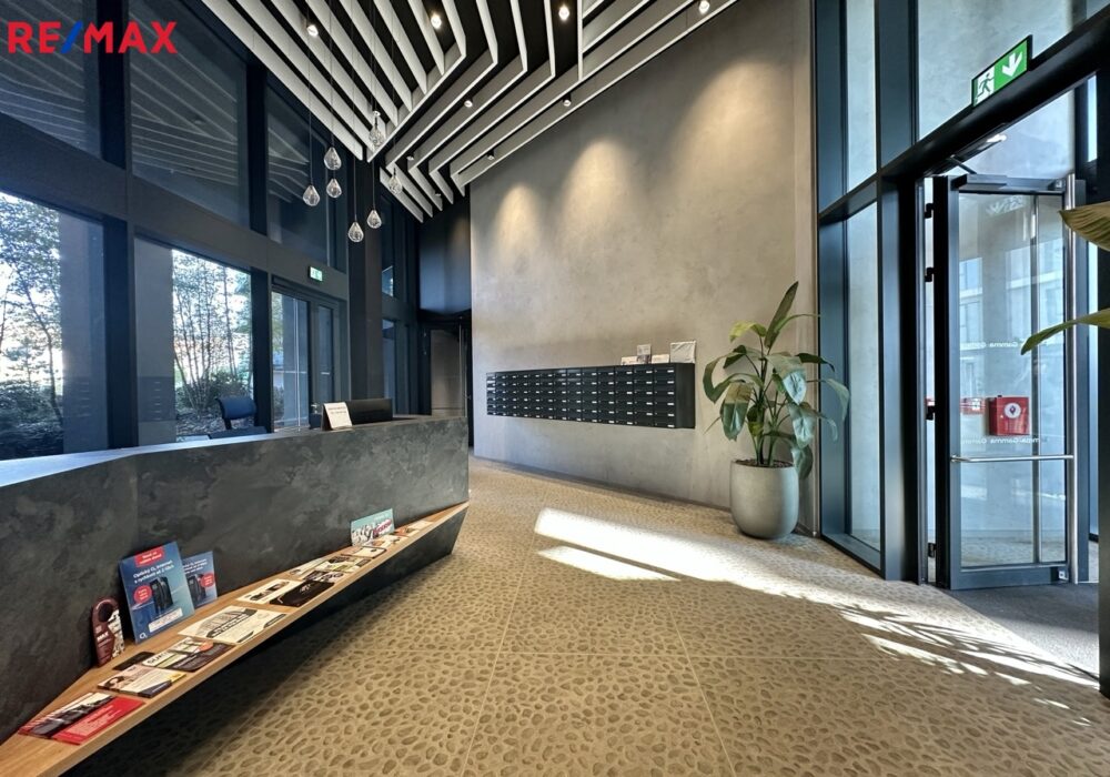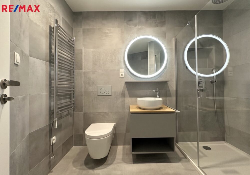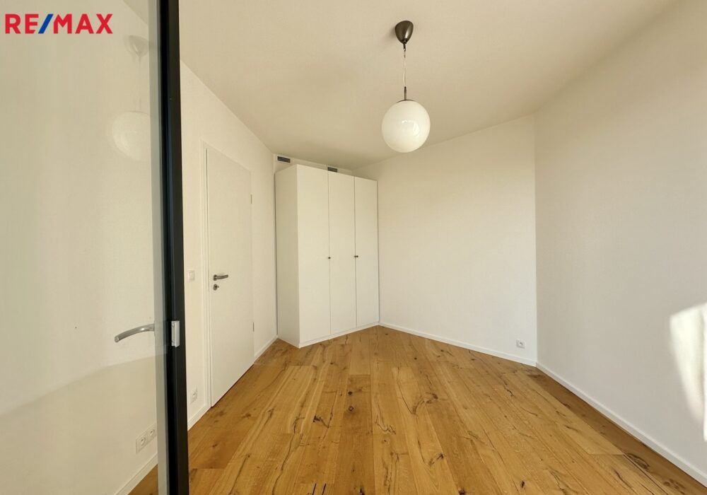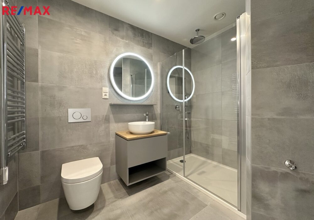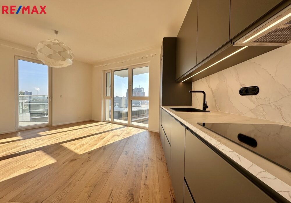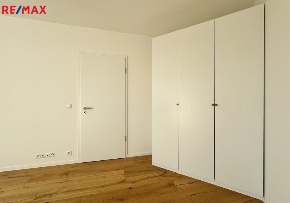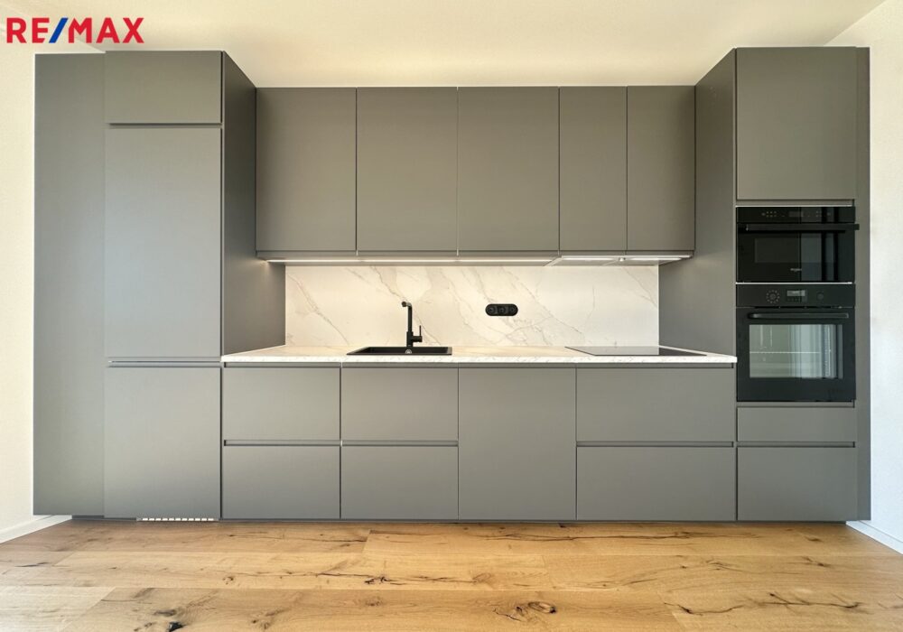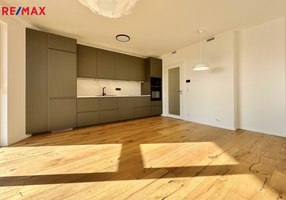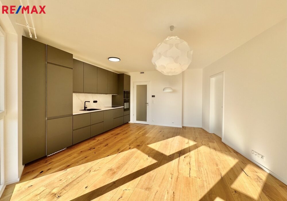 Hlavní místnost nabízí plně vybavenou kuchyň – myčka nádobí, indukční varná deska, digestoř, horkovzdušná pečící trouba, mikrovlnná trouba, lednice s mrazničkou, vše doplněno dostatkem úložného a pracovního prostoru. Dále jsou k dispozici prostorné skříně v předsíni i v ložnici. V obytných místnostech je dřevěná podlaha, v koupelně a na chodbě dlažba a celý byt je vybaven podlahovým vytápěním. Elegantní koupelna nabízí sprchový kout, umyvadlo, toaletu, topný žebříček, přípravu pro pračku/sušičku a úložnou skřínku pod umyvadlem. Velkoformátová okna s trojskly jsou doplněna přípravou pro zavěšení záclon a závěsů. Vstupní dveře jsou bezpečnostní (třída 3) a vnitřní dveře Hörmann mají nadstandardní výšku 210 cm.
