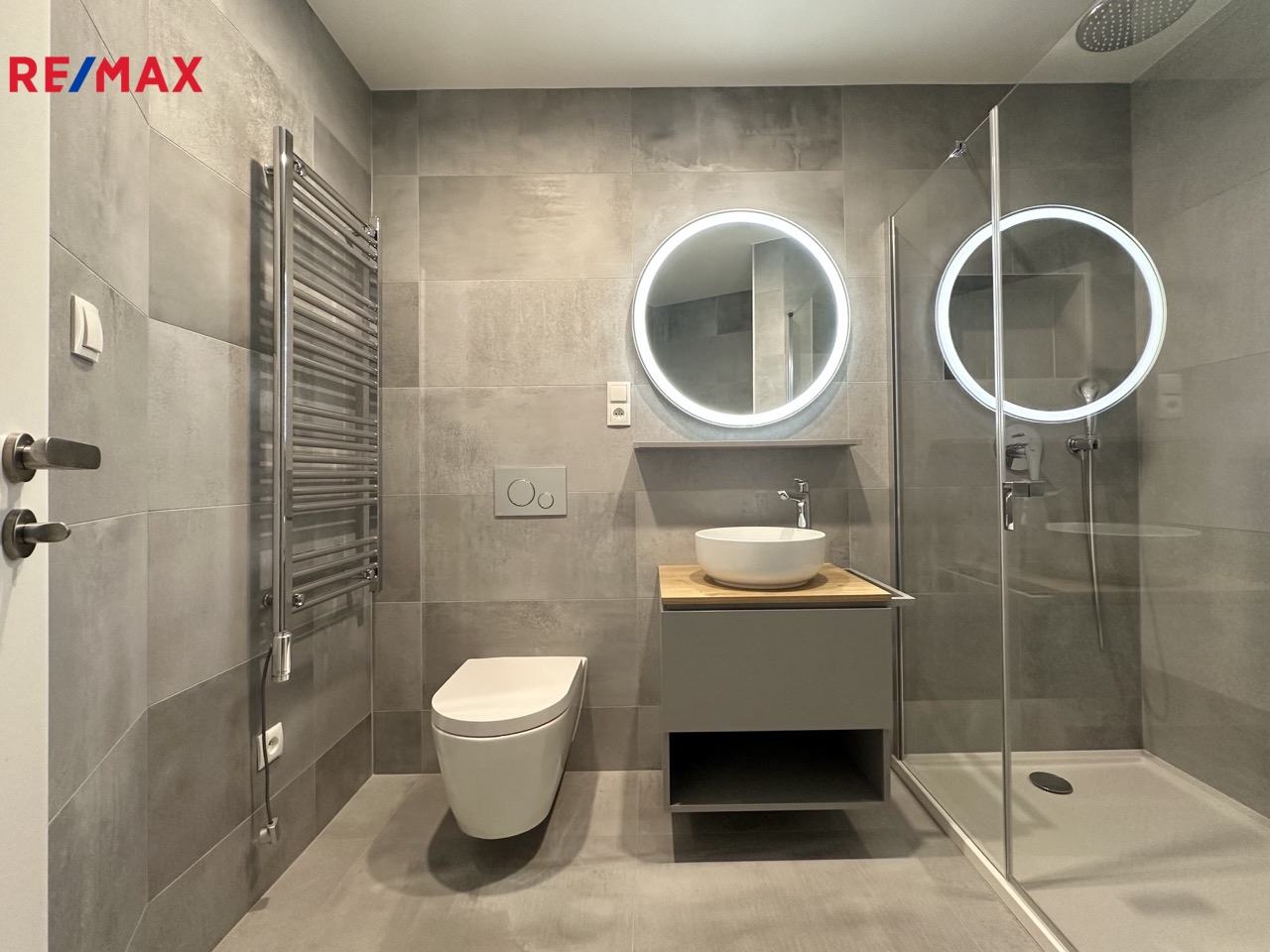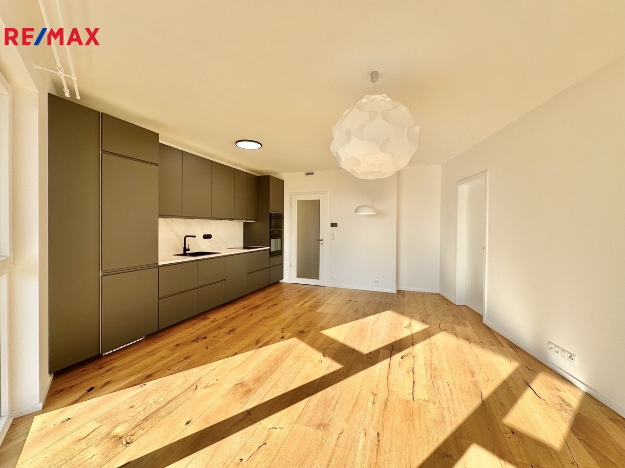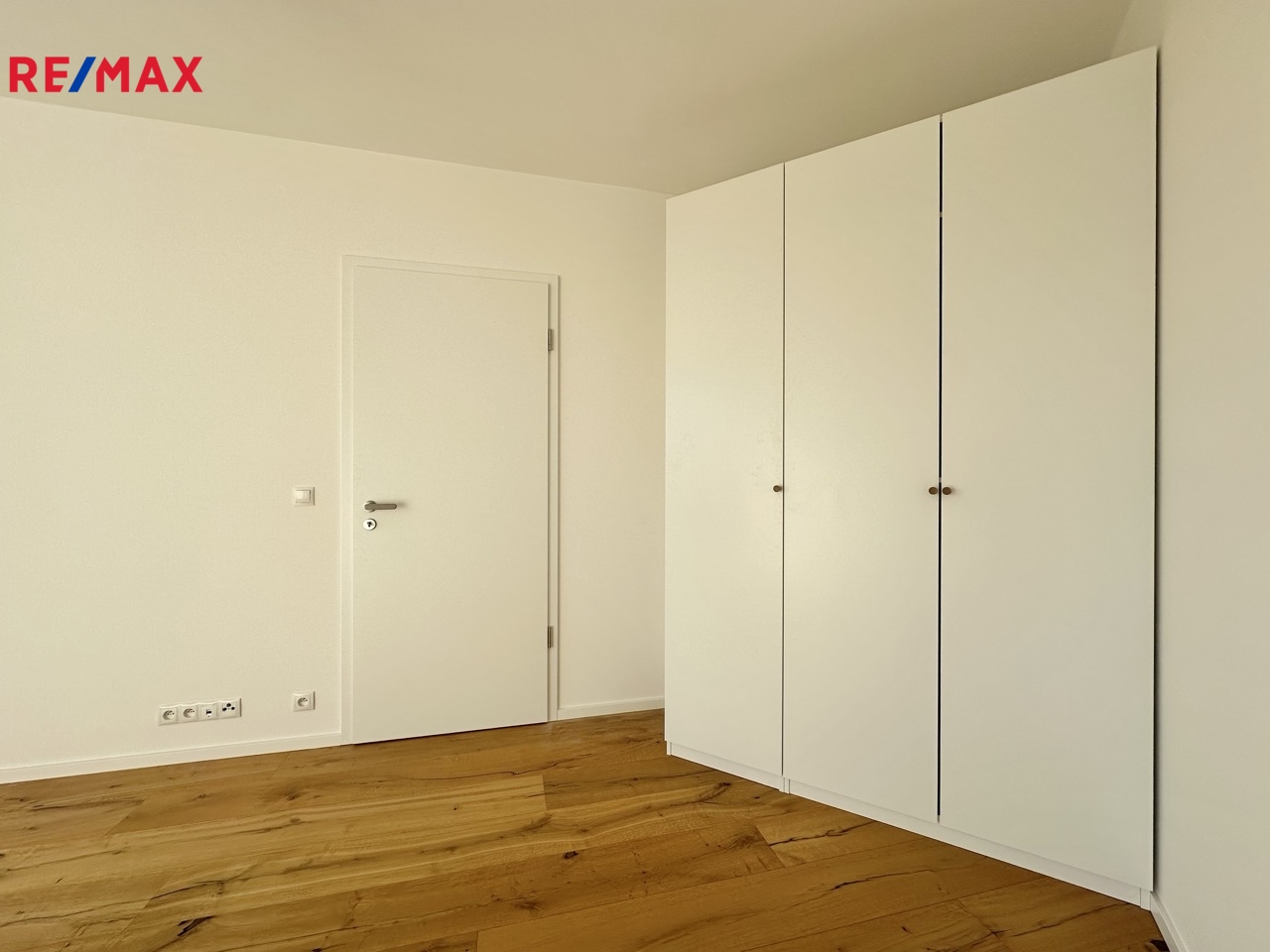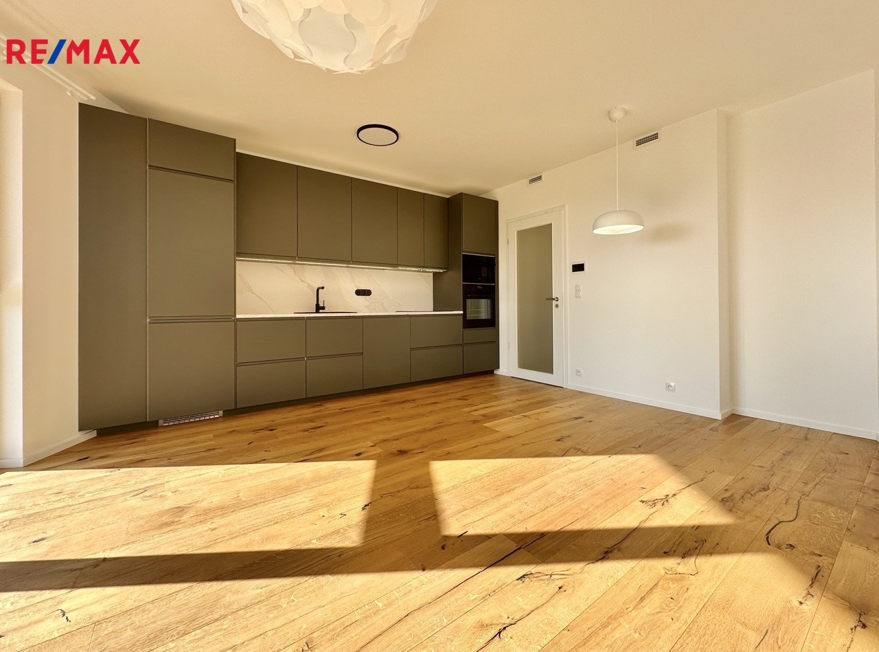 Hlavní místnost nabízí plně vybavenou kuchyň – myčka nádobí, indukční varná deska, digestoř, horkovzdušná pečící trouba, mikrovlnná trouba, lednice s mrazničkou, vše doplněno dostatkem úložného a pracovního prostoru. Dále jsou k dispozici prostorné skříně v předsíni i v ložnici. V obytných místnostech je dřevěná podlaha, v koupelně a na chodbě dlažba a celý byt je vybaven podlahovým vytápěním. Elegantní koupelna nabízí sprchový kout, umyvadlo, toaletu, topný žebříček, přípravu pro pračku/sušičku a úložnou skřínku pod umyvadlem. Velkoformátová okna s trojskly jsou doplněna přípravou pro zavěšení záclon a závěsů. Vstupní dveře jsou bezpečnostní (třída 3) a vnitřní dveře Hörmann mají nadstandardní výšku 210 cm.