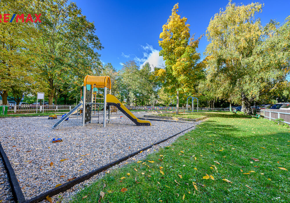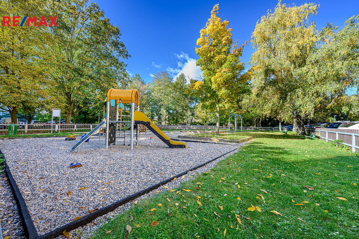 V okolí domu je spousta zeleně, dětské hřiště a klid.