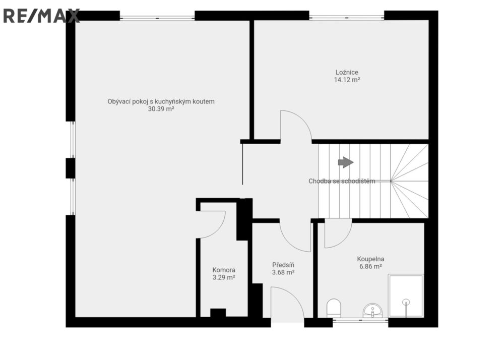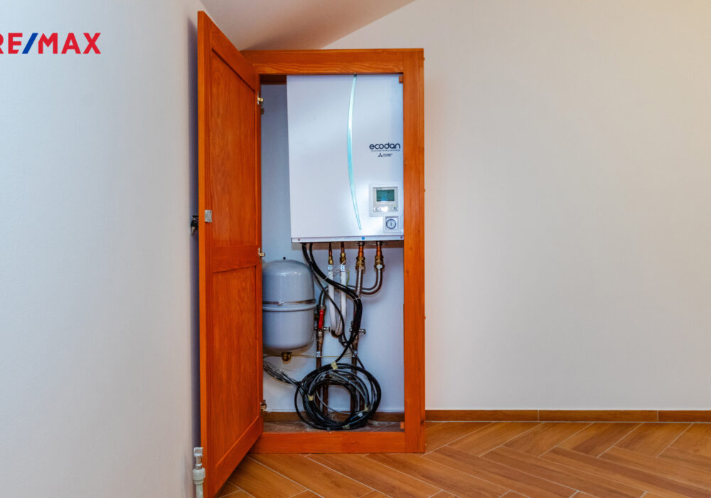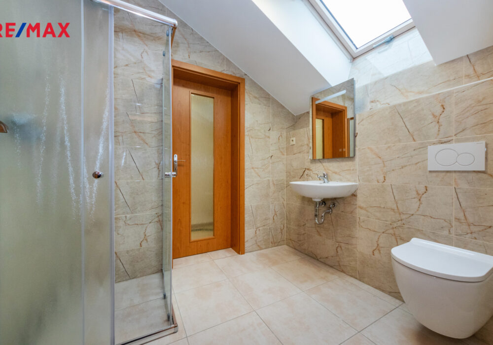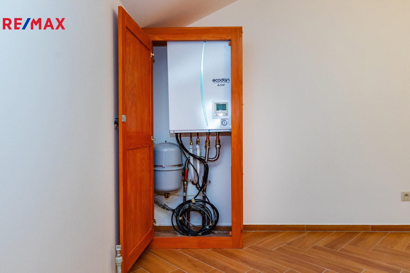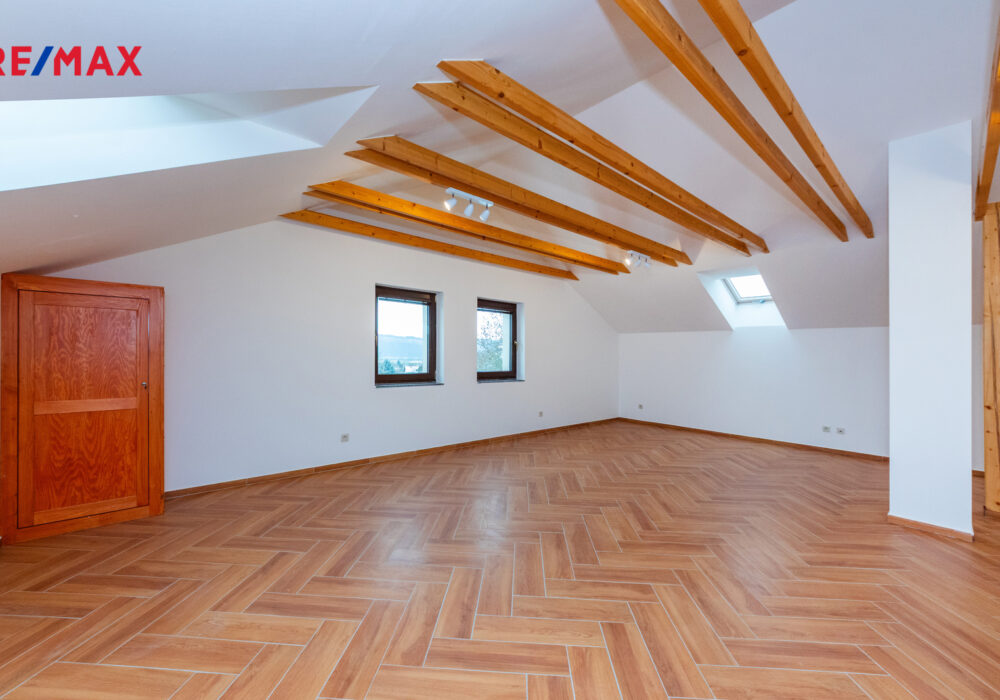 V prvním patře je obývací pokoj s kuchyňským koutem (včetně trouby, myčky a mikrovlnné trouby), komora, jeden samostatný pokoj, koupelna se sprchovým koutem a WC. V podkroví je další pokoj, technická místnost, druhá koupelna se sprchou a WC.