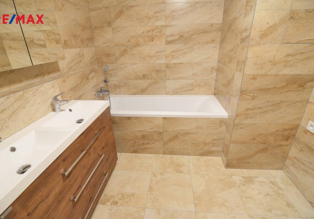 V bytě dále nalezneme dvě samostatné ložnice, velkou koupelnu s vanou, umyvadlem a prostorem pro pračku. WC s umyvadlem je zvlášť.
