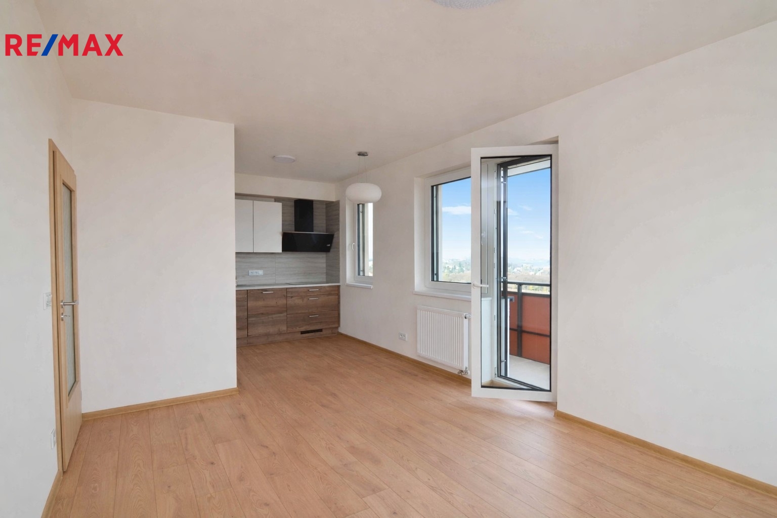 Dominantou tohoto bytu je prostorný a světlý obývací pokoj s kuchyňským koutem vybaveným veškerými vestavěnými spotřebiči.