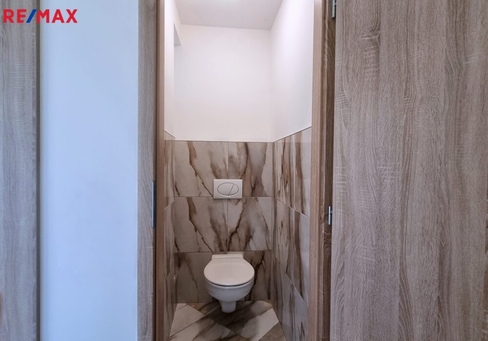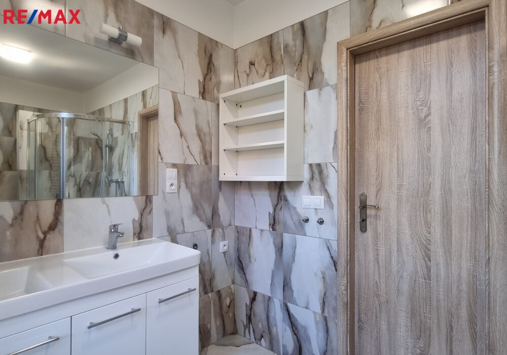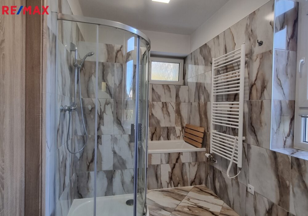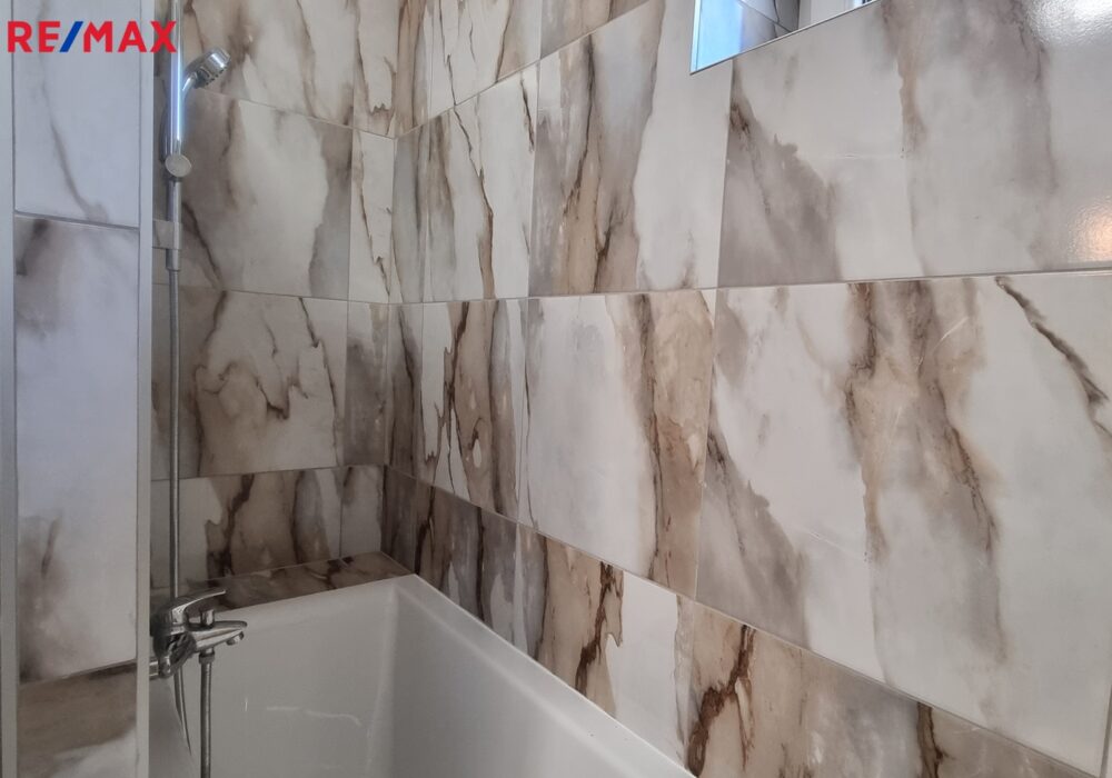 Koupelna je vybavena vanou i sprchovým koutem a přípojkou na pračku, WC je oddělené.