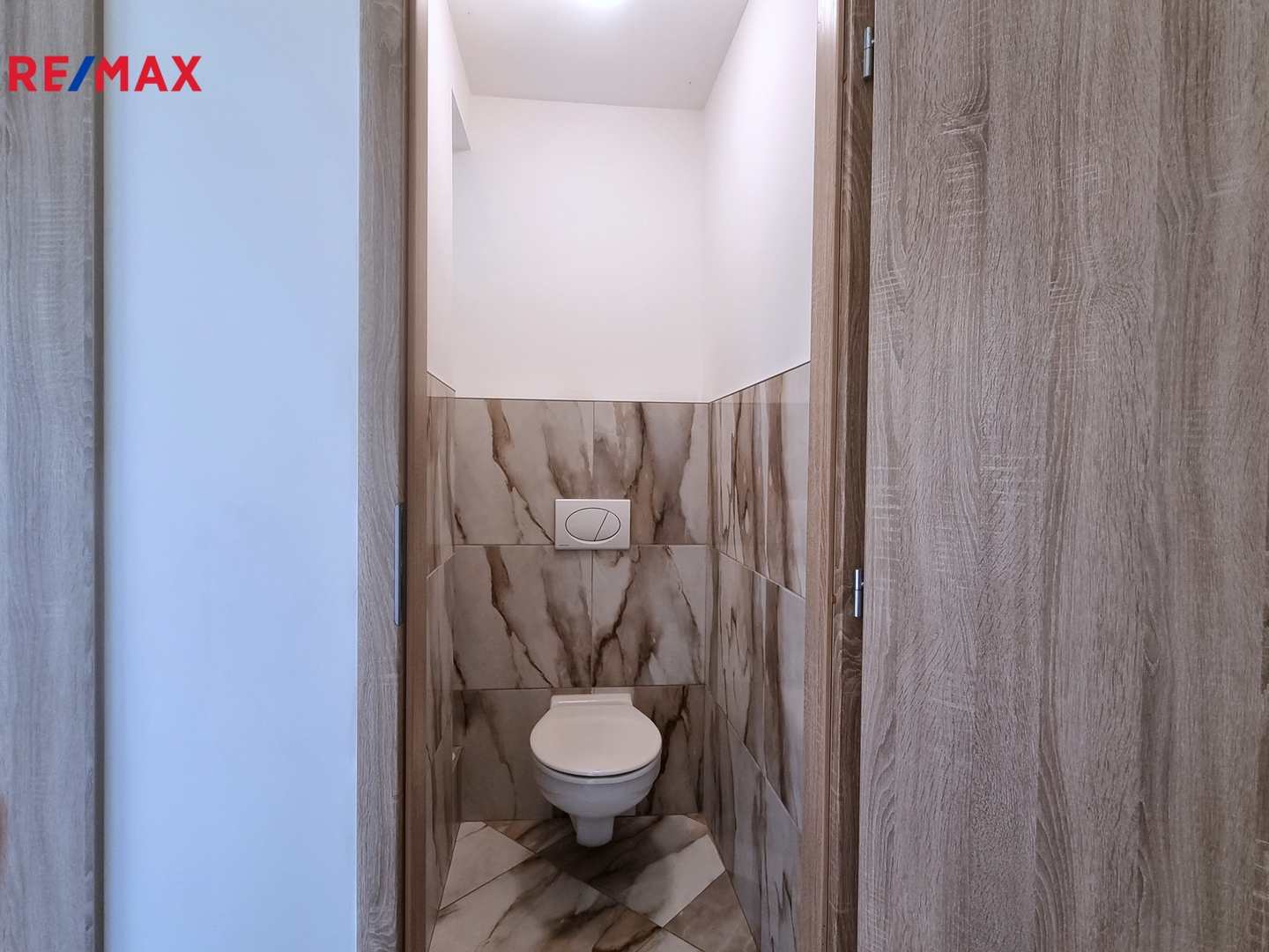 Koupelna je vybavena vanou i sprchovým koutem a přípojkou na pračku, WC je oddělené.