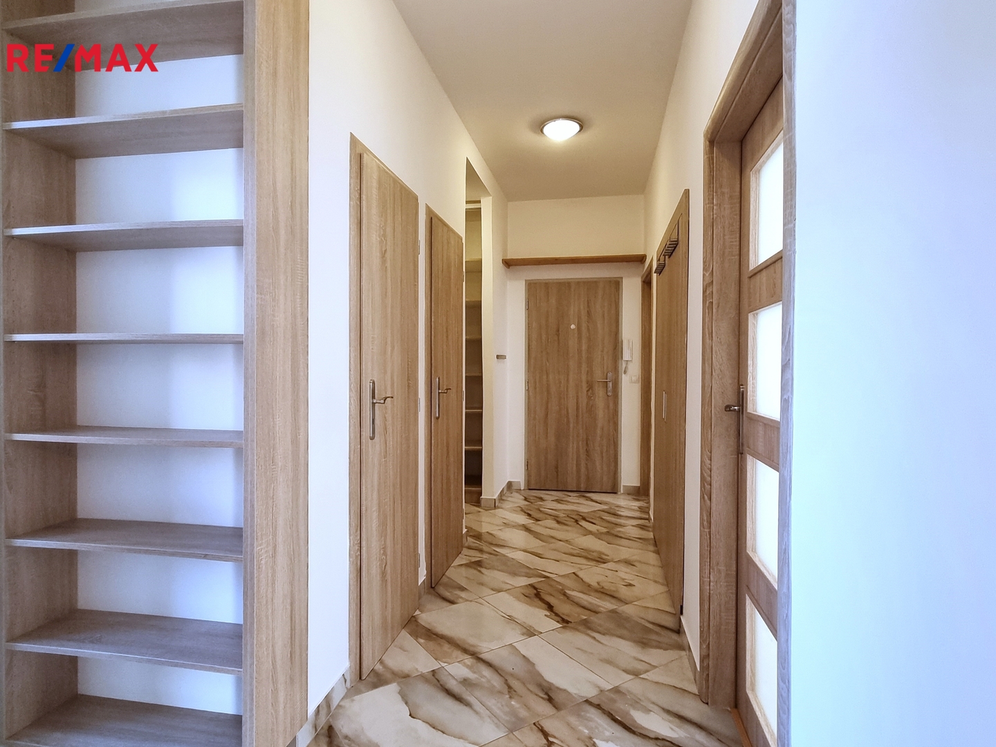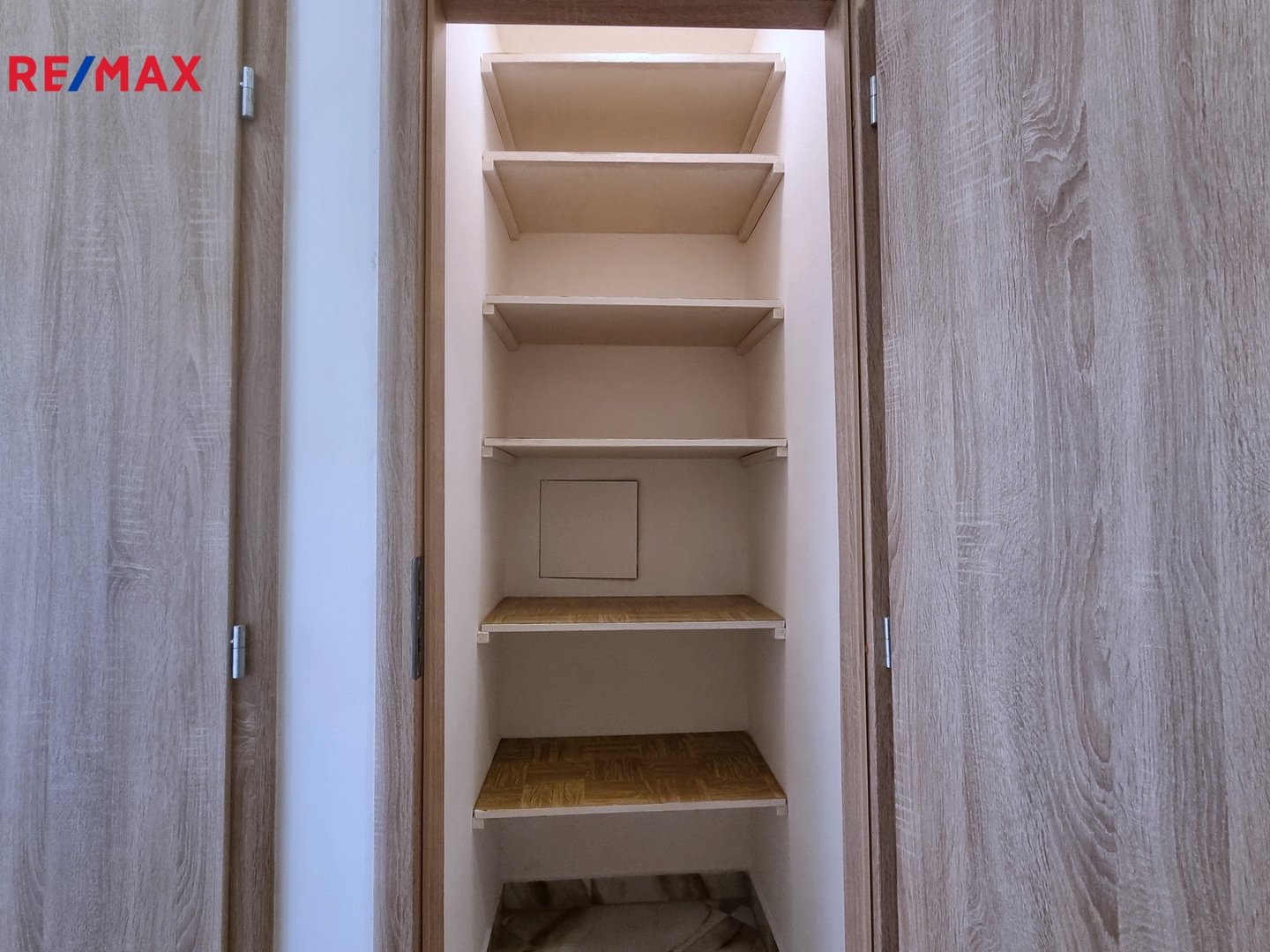 Součástí bytu jsou praktické úložné prostory – vestavěná skříň v ložnici, vestavěný botník a skříň na chodbě, spíž a sklep. K bytu náleží malý zasklený balkon.