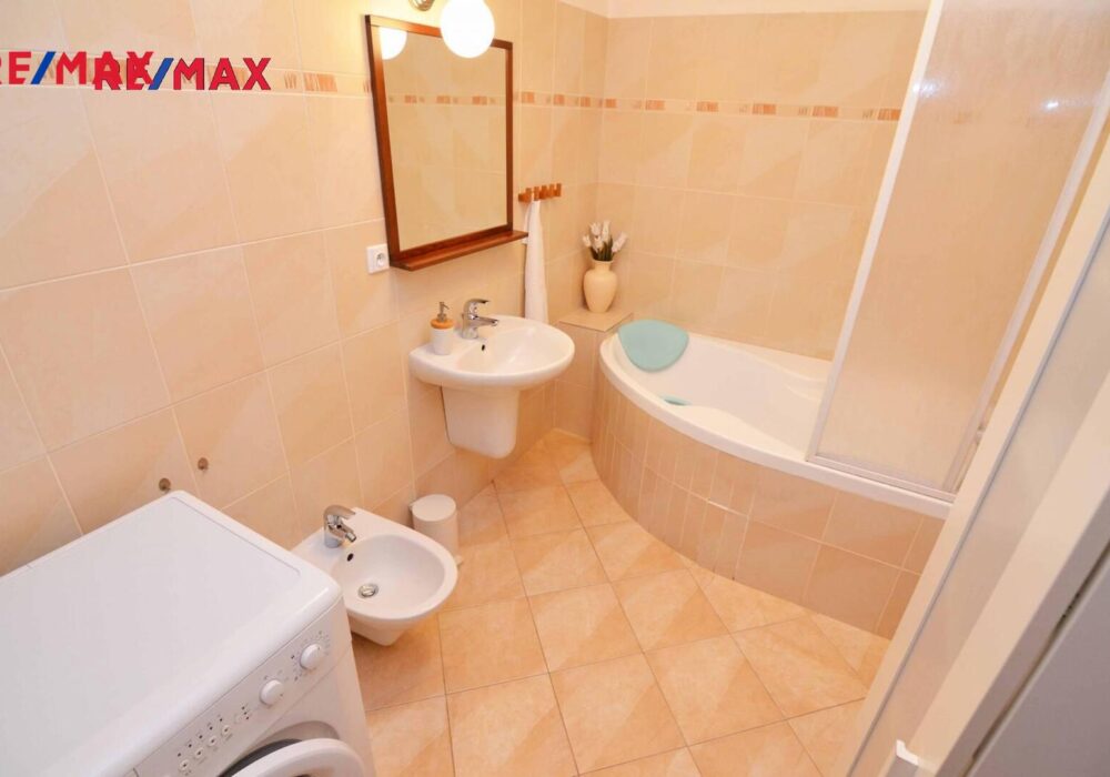 Dominantou tohoto bytu je velký obývací pokoj s kuchyňským koutem vybaveným linkou s veškerými spotřebiči a neschází zde ani spíž.