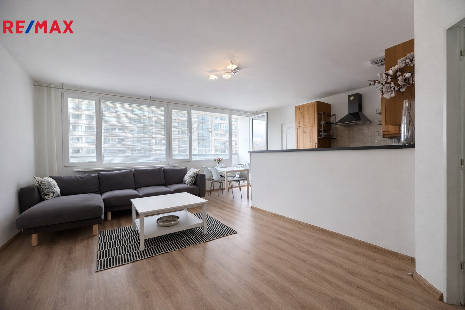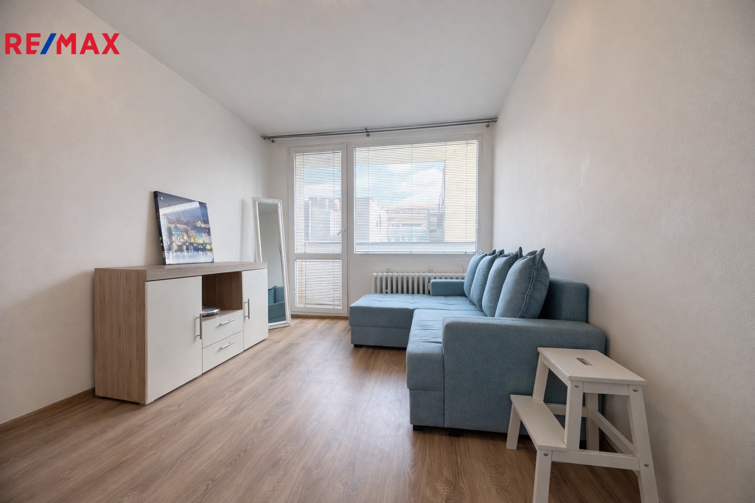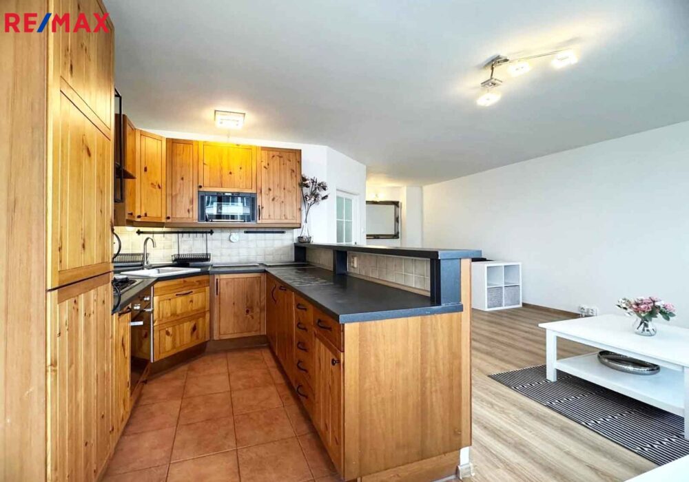 Dominantou tohoto bytu je nadstandardně velký obývací pokoj s kuchyňskou linkou vybavenou veškerými spotřebiči.