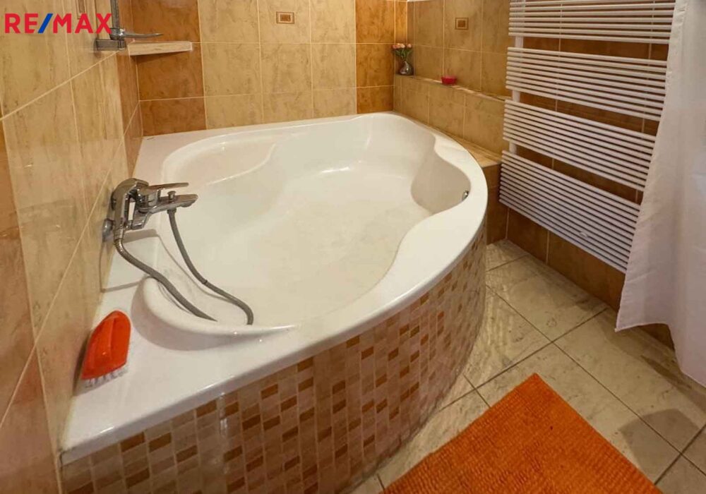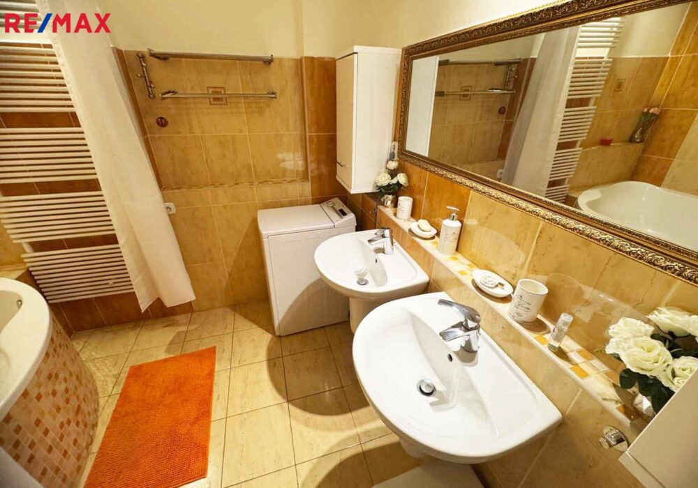 Prostorná koupelna s rohovou vanou, dvěma umyvadly. WC samostatné.