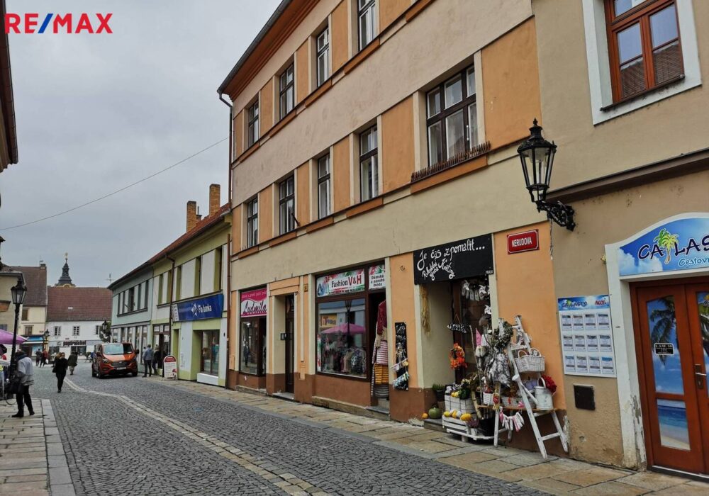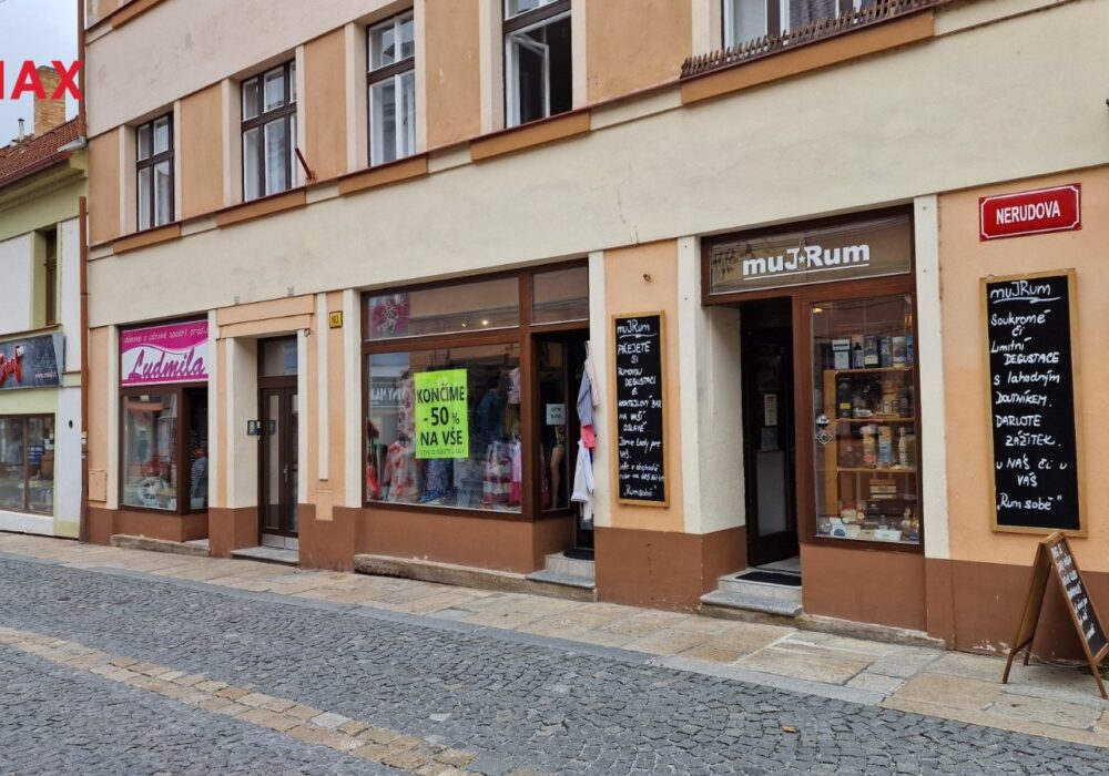 Nabízíme k pronájmu obchodní prostory v centru města Písek na pěší zóně v Nerudově ulici č. 163 o výměře 76 m2. 76.15 m2. K dispozici je samostatné uzamykatelné zázemí (sklad, kancelář), vlastní WC, zkušební kabinky, prostorná výloha do pěší zóny, elektrické přímotopy. Prostory sloužily dlouhodobě jako prodejna textilu, je možné ale jejich účel změnit.
