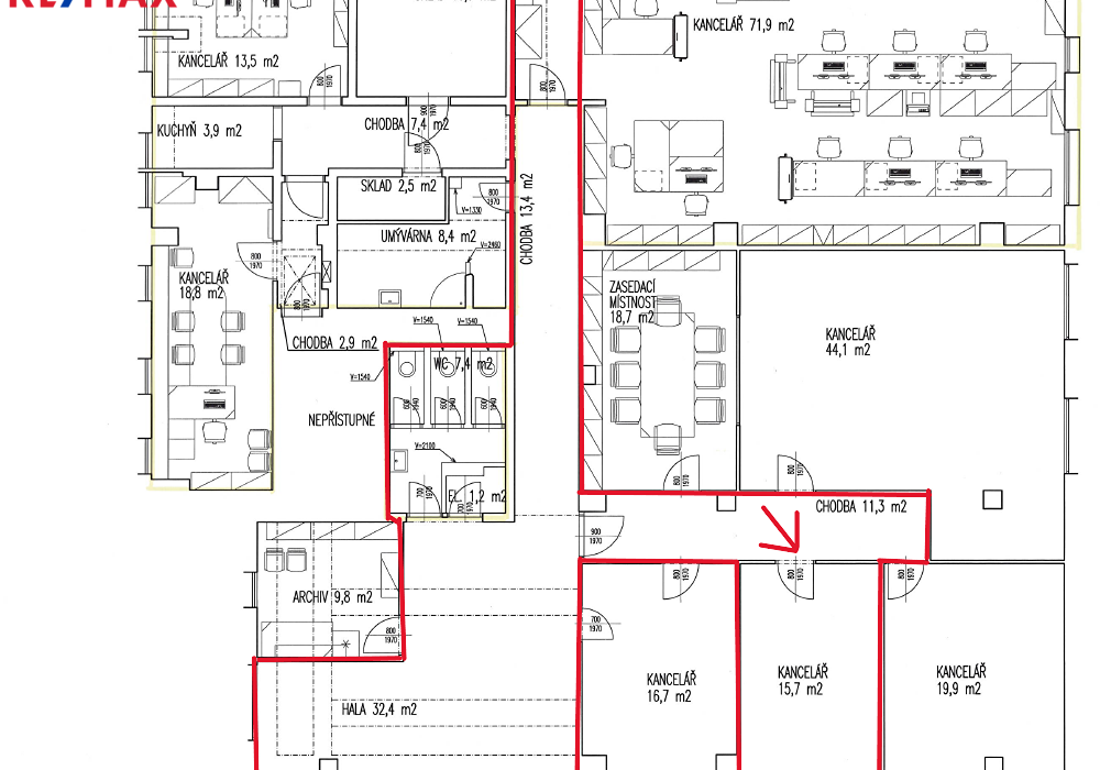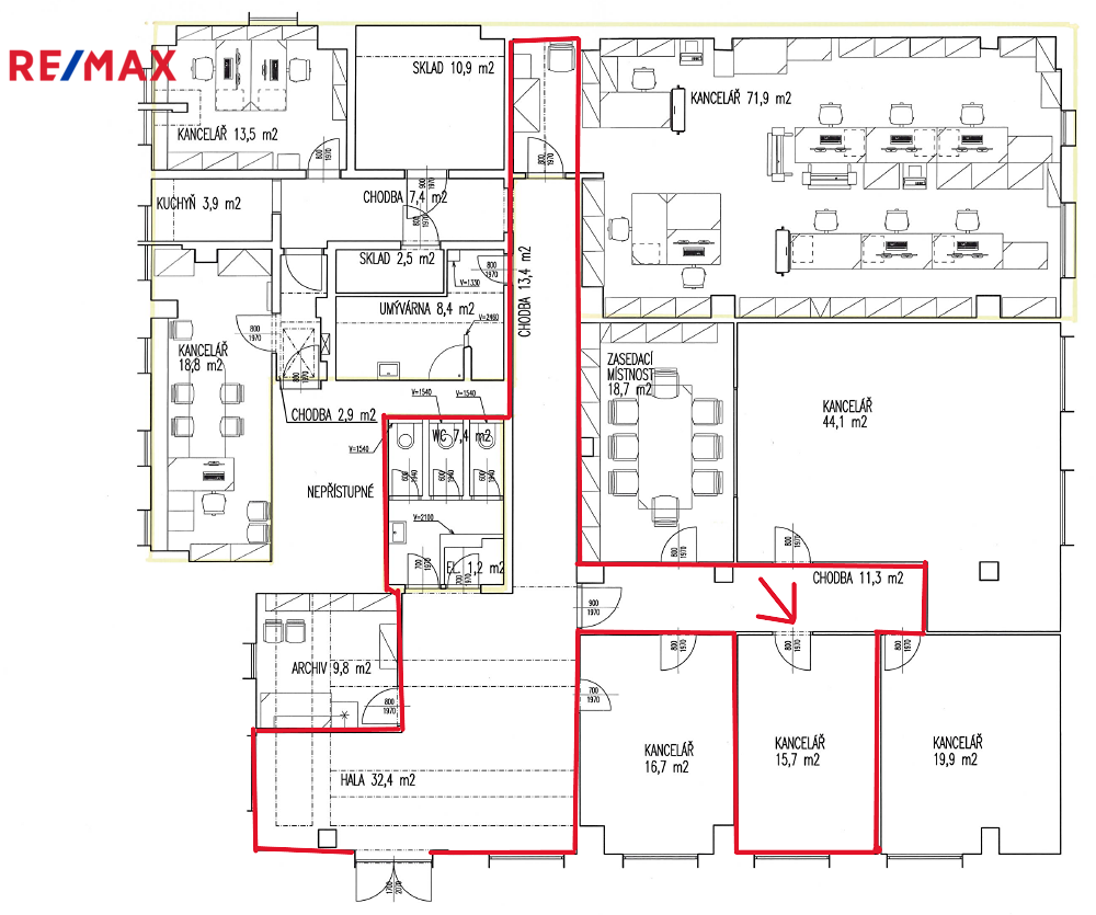 Kancelář není vybavena nábytkem. Společná kuchyňka s WC. K dispozici je možnost pronajmout si více kanceláří najednou, které se nacházejí na stejném patře.