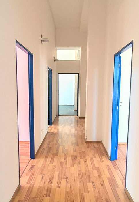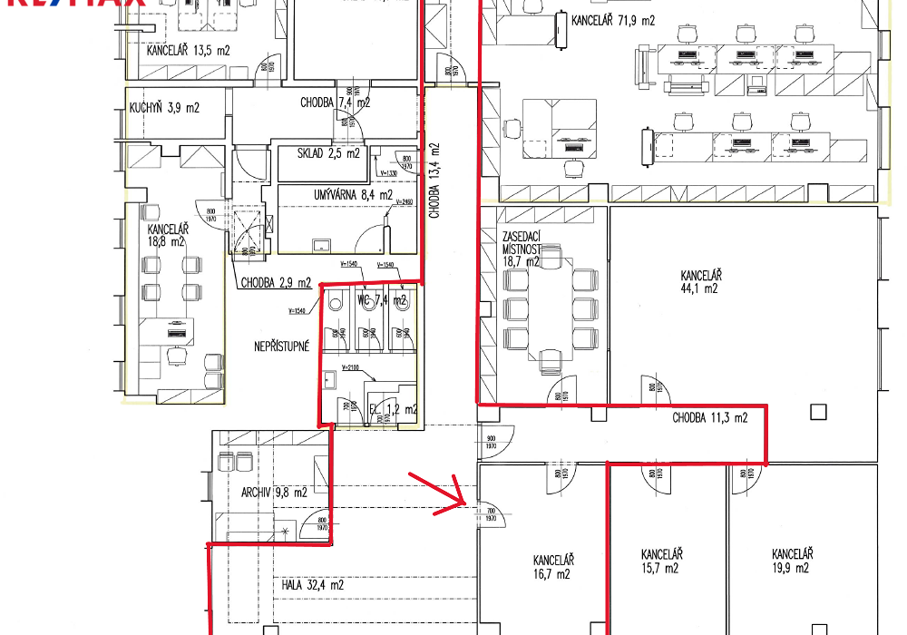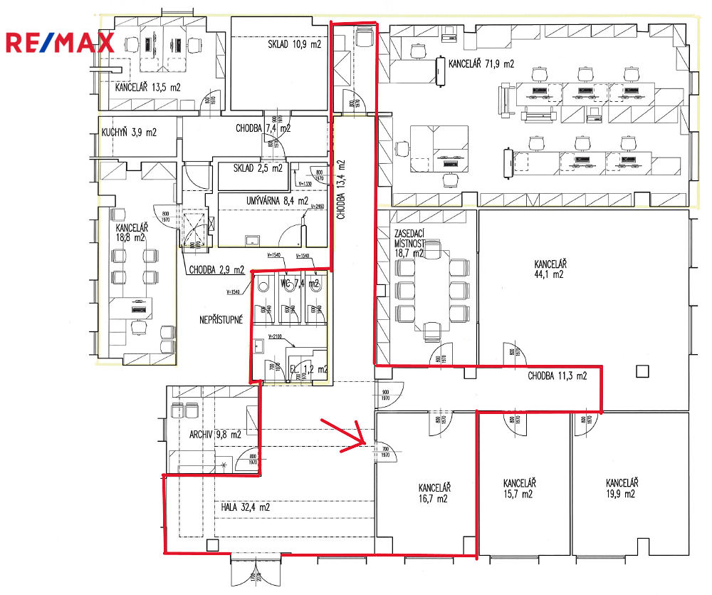 Kancelář není vybavena nábytkem. Společná kuchyňka s WC. K dispozici je možnost pronajmout si více kanceláří najednou, které se nacházejí na stejném patře.