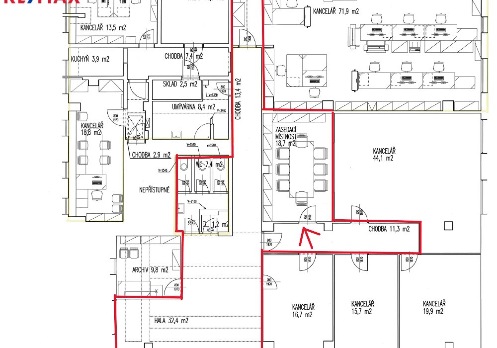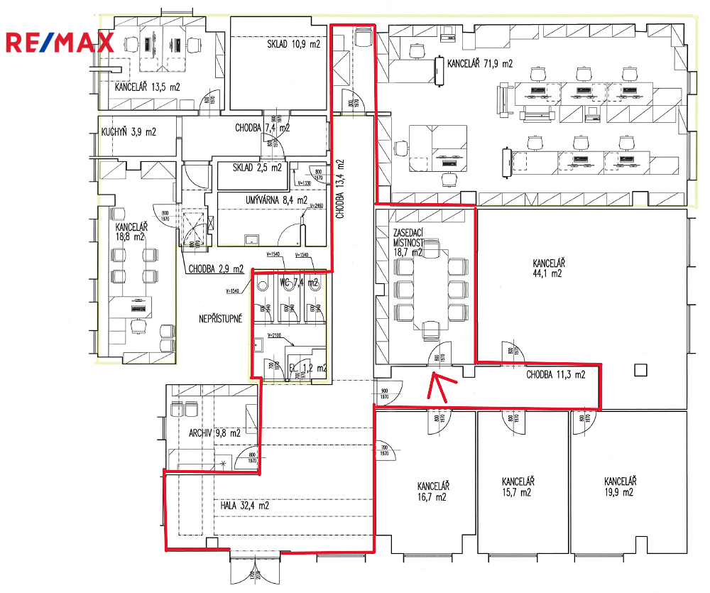 Kancelář není vybavena nábytkem. Společná kuchyňka s WC. K dispozici je možnost pronajmout si více kanceláří najednou, které se nacházejí na stejném patře.