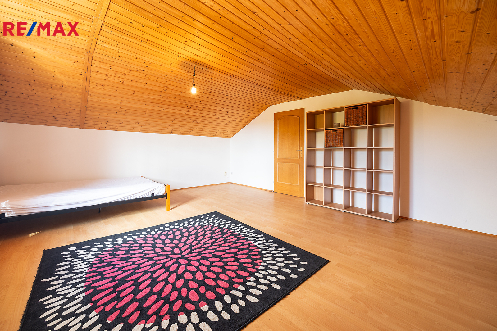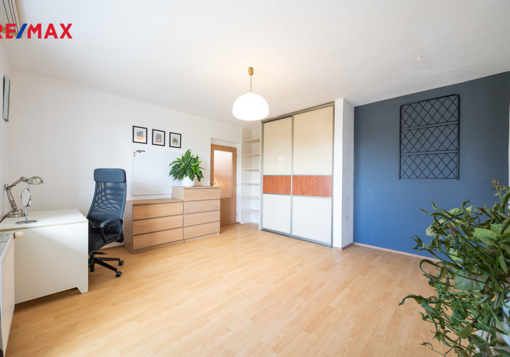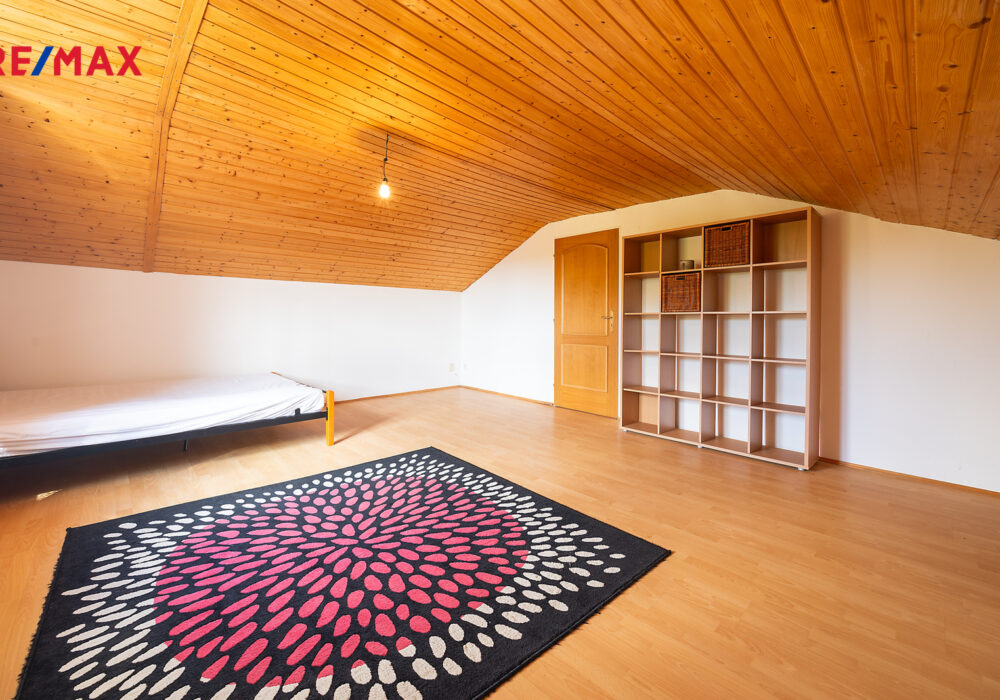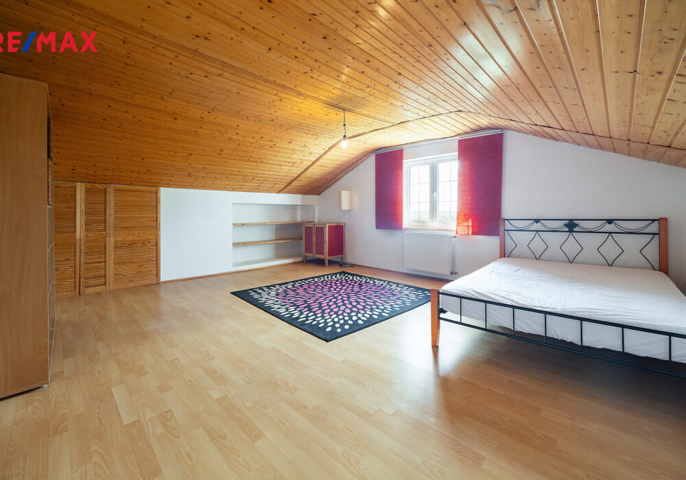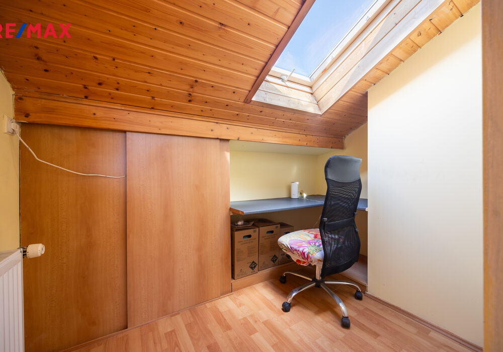 V přízemí se nachází obývací pokoj s kuchyňským koutem a zastřešenou terasou se vstupem do zahrady. V 1.patře se pak nacházejí dva pokoje, samostatná šatna a koupelna a v podkroví je další velký pokoj a malá pracovna.