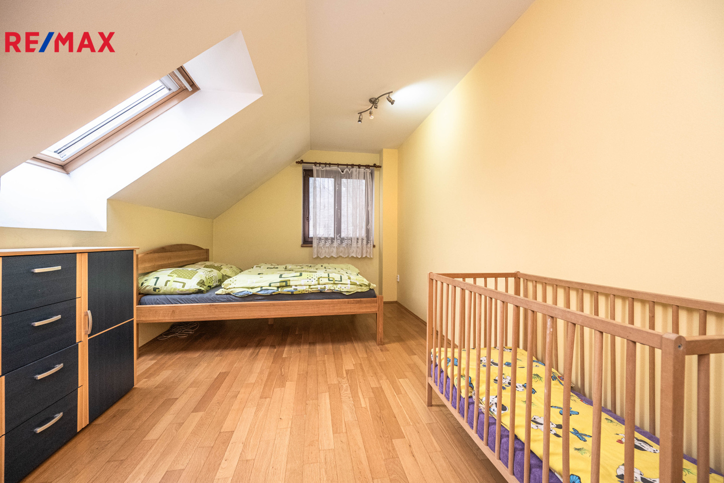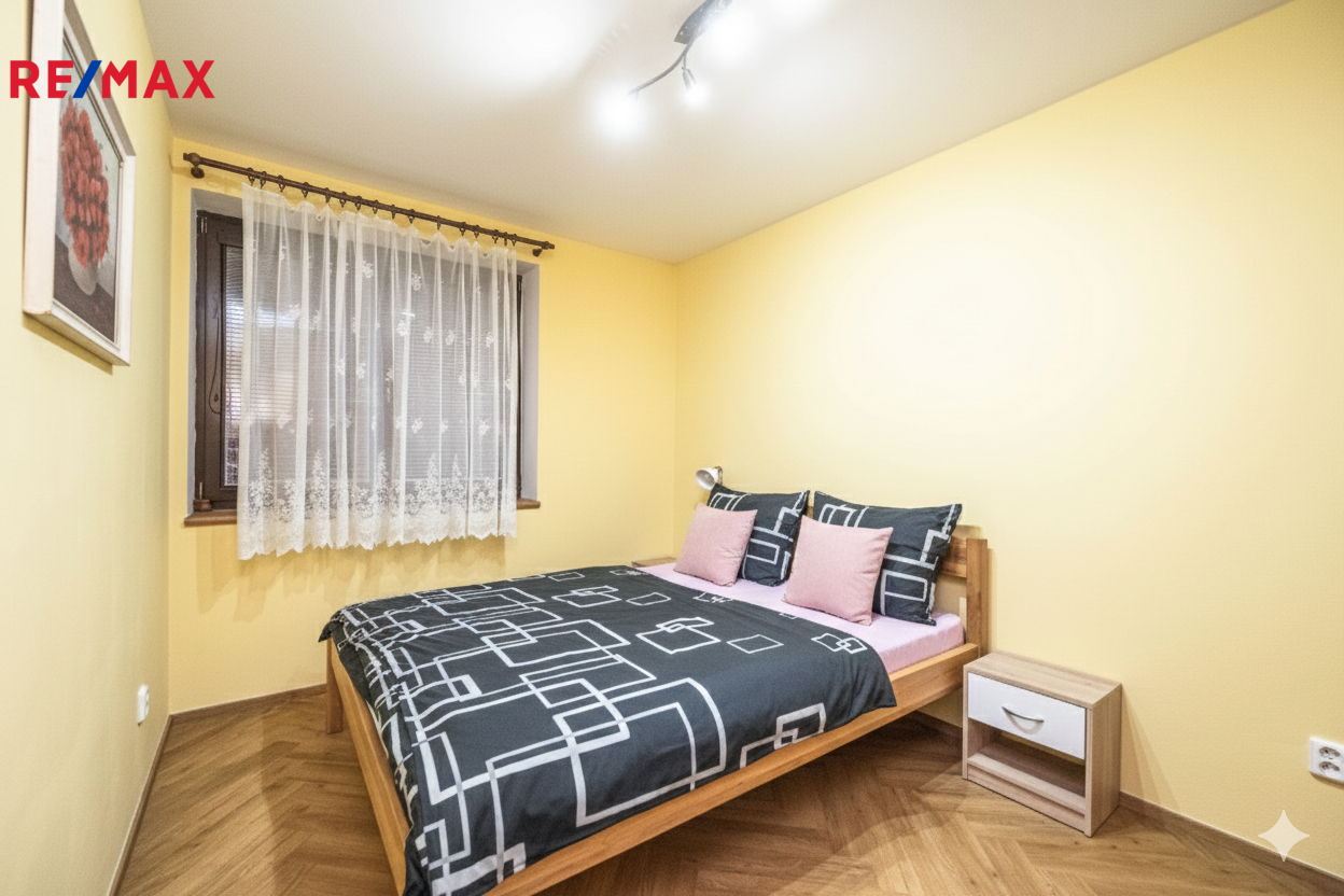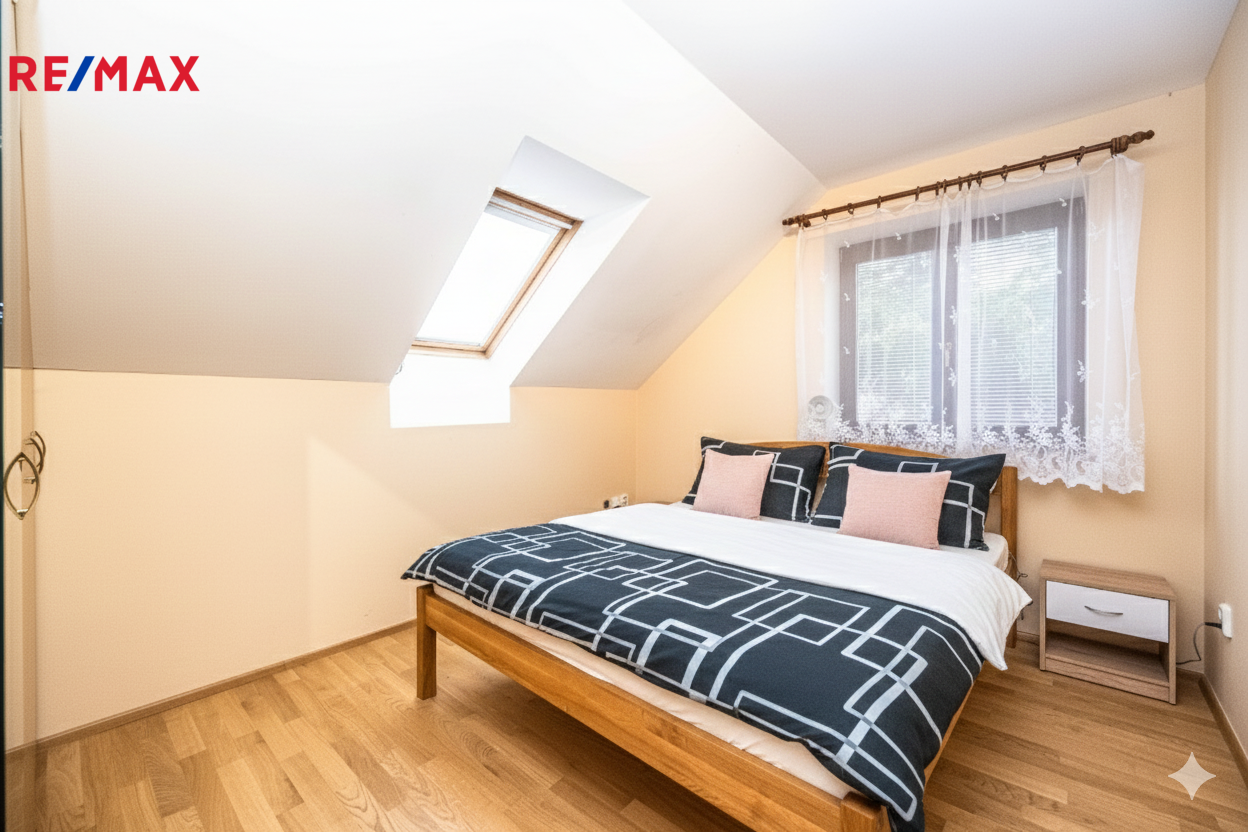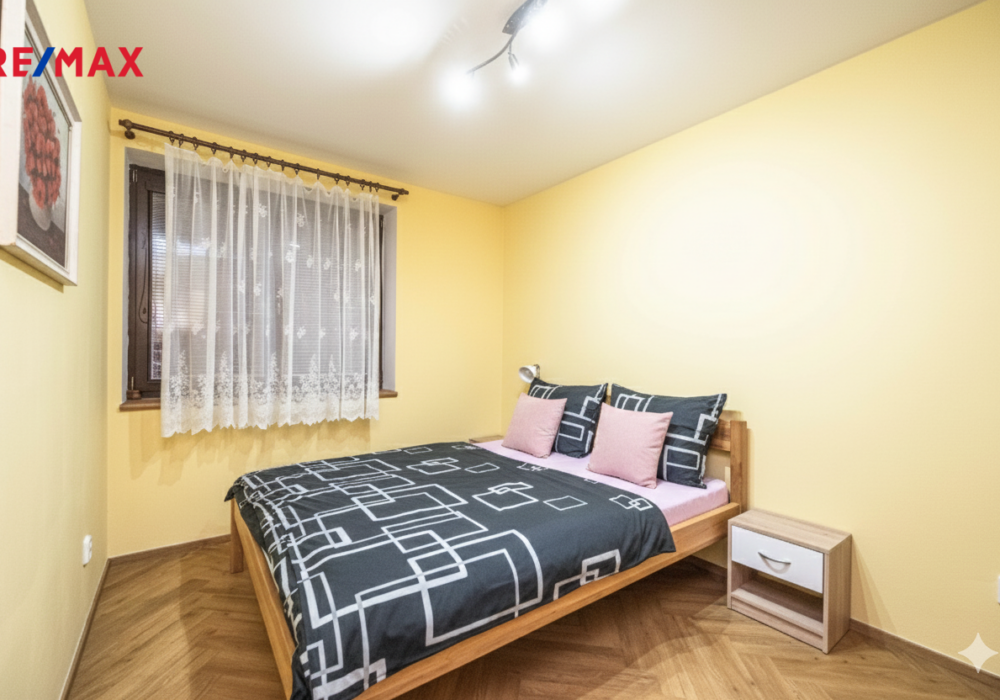 tři ložnice (2× manželská postel, 1× plnohodnotné trojlůžko vhodné pro děti), koupelna s vanou, samostatné WC